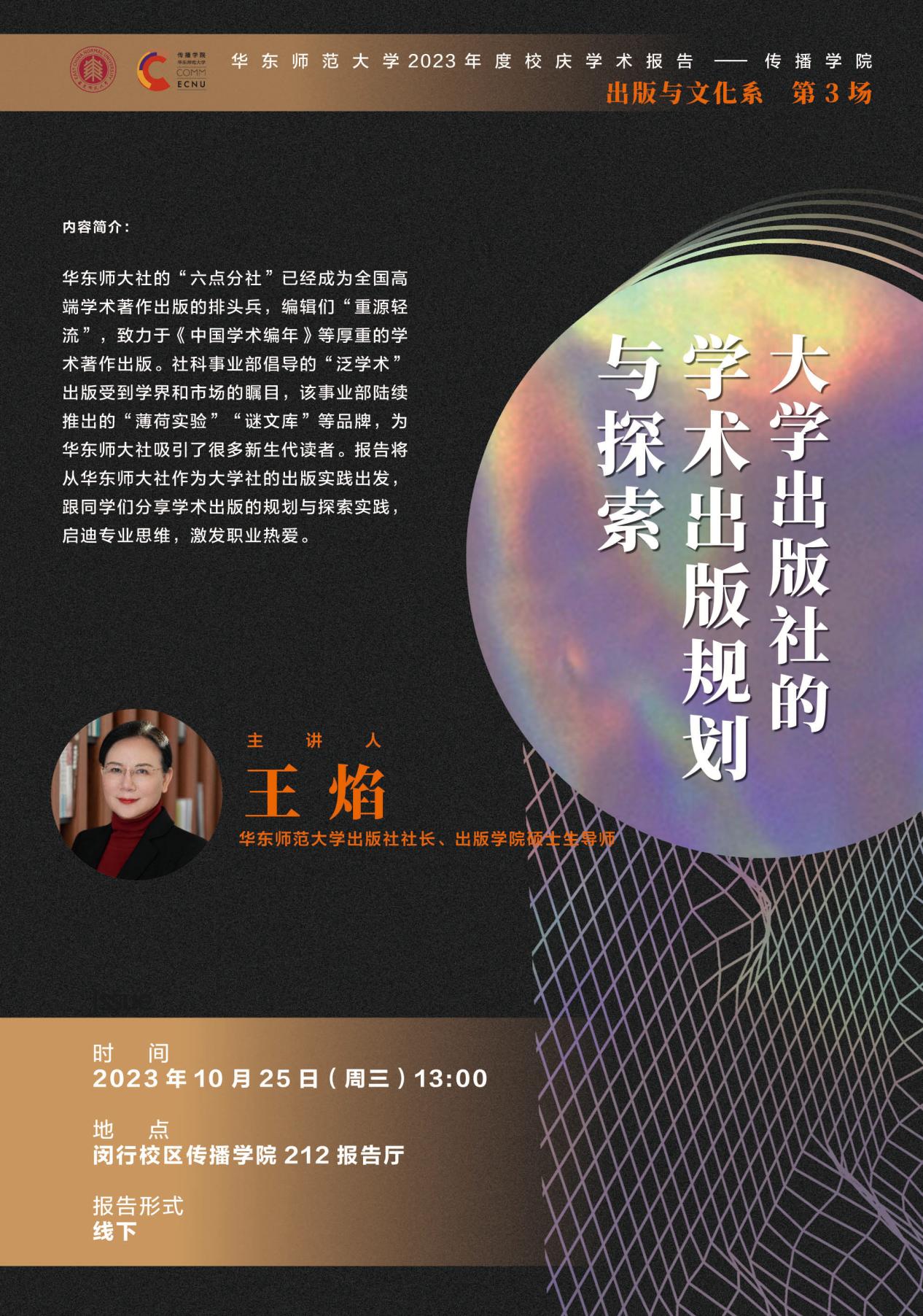 华东师大社的“六点分社”已经成为全国高端学术著作出版的排头兵,编辑们“重源轻流”,致力于《中国学术编年》等厚重的学术著作出版。社科事业部倡导的“泛学术”出版受到学界和市场的瞩目,该事业部陆续推出的“薄荷实验”“谜文库”等品牌,为华东师大社吸引了很多新生代读者。报告将从华东师大社作为大学社的出版实践出发,跟同学们分享学术出版的规划与探索实践,启迪专业思维,激发职业热爱。