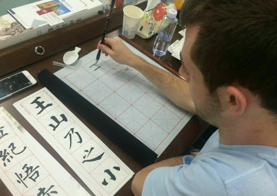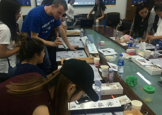 (中美大学生在书法活动中学写毛笔字)