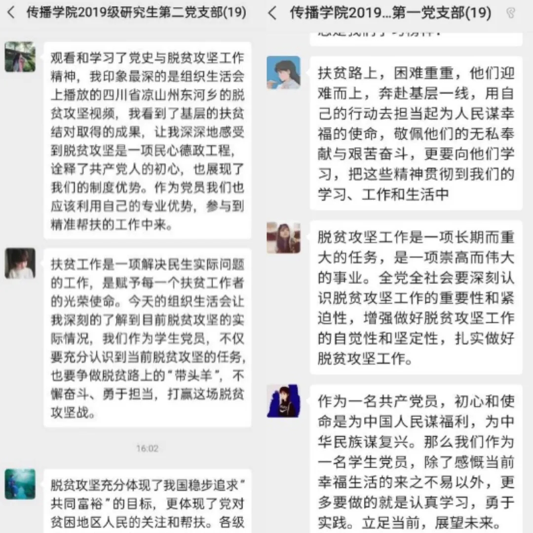 党员们一起观看视频,学习云南省普洱市景东(彝族自治)县援滇干部杨建兴、宋杰父子的扶贫事例,因为他们的辛劳与奉献而肃然起敬;也从四川省凉山州喜德镇东河乡的脱贫攻坚事例中,因为看到那么多人的付出得到了回报而激动不已。各位党员也在线上或微信群里分享了自己的感悟和体会。王梦蕾同志表示:“我深深地感受到脱贫攻坚是一项民心德政工程,诠释了共产党人的初心,也展现了我们的制度优势。作为党员我们也应该利用自己的专业优势,参与到精准帮扶的工作中来。”