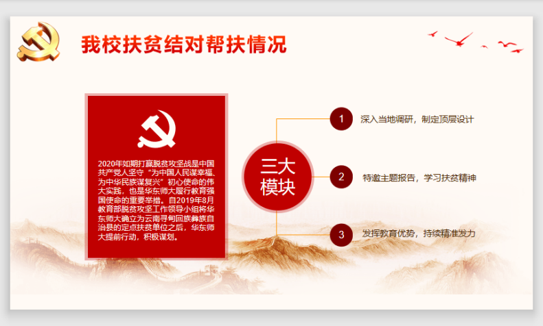 自2019年8月教育部脱贫攻坚工作领导小组将华东师大确立为云南寻甸回族彝族自治县的定点扶贫单位之后,华东师大提前行动,积极谋划。学校将结对帮扶工作划分为三大模块:深入当地调研,制定顶层设计;特邀主题报告,学习扶贫精神;发挥教育优势,持续精准发力。通过主持人的介绍,党员们对偷情 对口帮扶工作的具体情况有了更深入的了解。