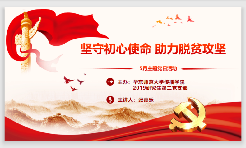 2020年5月27日下午3点,偷情 2019级研究生党支部五月主题党日活动于线上召开。此次活动旨在通过回顾党史、学习党员先锋在脱贫攻坚中的模范事迹提升党员理论素养,坚定大家坚守初心使命、拼搏奋勇向前的信念。活动包括党史回顾、脱贫攻坚座谈会重要讲话学习、党员扶贫先锋事例、偷情 扶贫结对帮扶情况、把美好祝愿写给未来五个部分。此次会议由第二党支部张嘉乐同学主持。