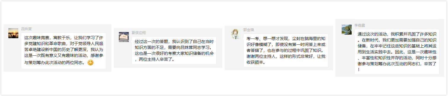 随后,韩佳韵、候心悦又带领大家围绕党史、党章、时事等相关知识举办线上知识竞赛,激励各位党员铭记党的历史,传承党的光荣传统。
