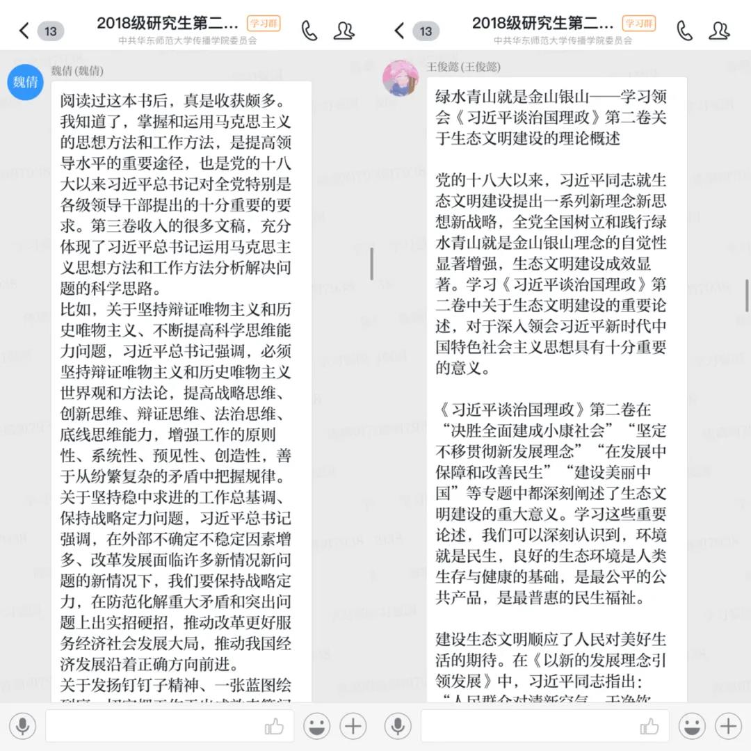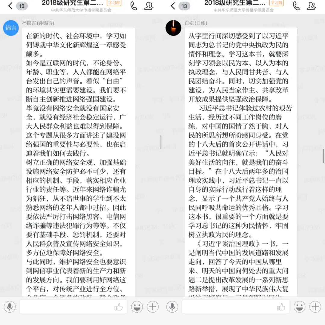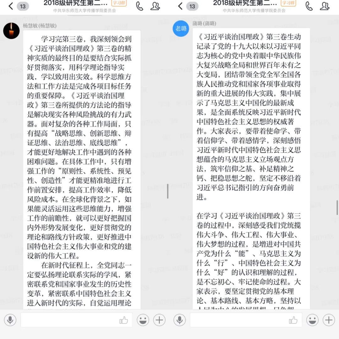 支部党员同志们纷纷表示,对《习近平谈治国理政》第三卷这本理论著作有了更系统的认识和更深层的领悟。《习近平谈治国理政》第三卷,对于推动广大党员、干部和群众学懂弄通做实习近平新时代中国特色社会主义思想,系统掌握贯穿其中的马克思主义立场观点方法,增强“四个意识”、坚定“四个自信”、做到“两个维护”,具有重要意义。理论的价值在于实践,学习的目的在于运用。偷情 2018级研究生第二党支部将继续认真学《习近平谈治国理政》第三卷,并努力做到学思而贯通、知信行一致,凝聚起同心共筑中国梦的磅礴力量。
