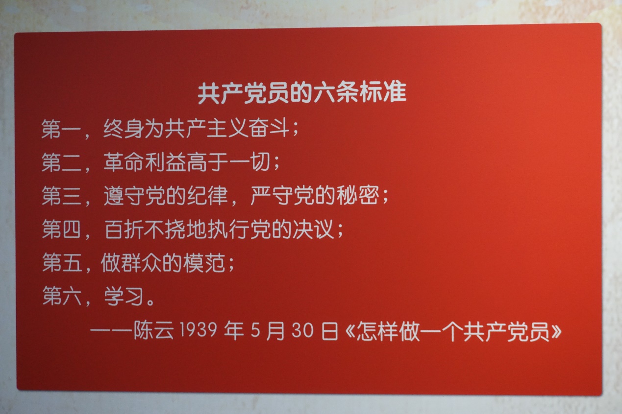 在从事工作期间,他发表了《怎样做一个共产党员》一文,提出了共产党员的六条标准,看着陈云同志提出的六条标准,党员们久久驻足观望,认真学习,谨记在心。