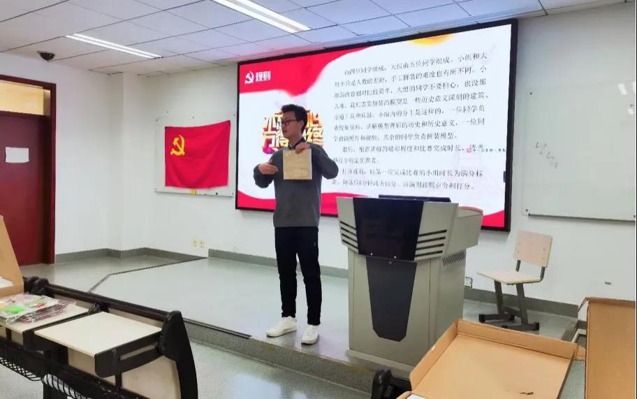 本次活动由 偷情 2020级研究生第一党支部书记韩亚鲁同志主持。竞赛正式开始之前,韩亚鲁同志宣布了活动的具体要求和评分细则。接下来,党员同志们随机结成小组,自行分工并协力搭建红色主题手工模型。