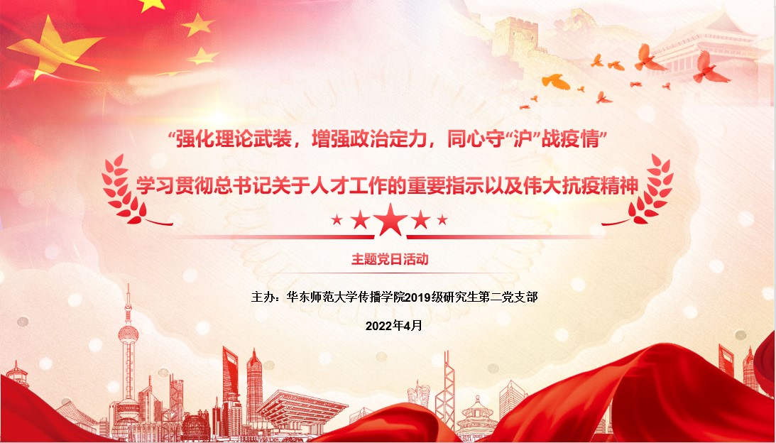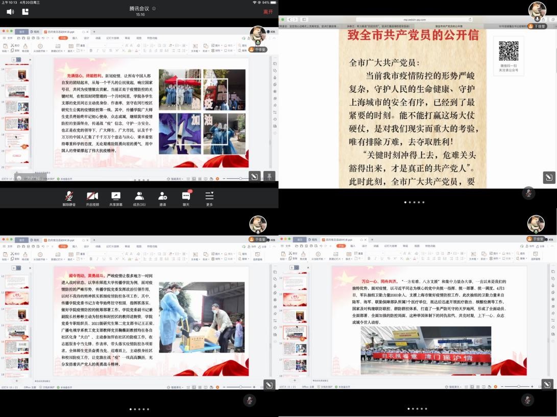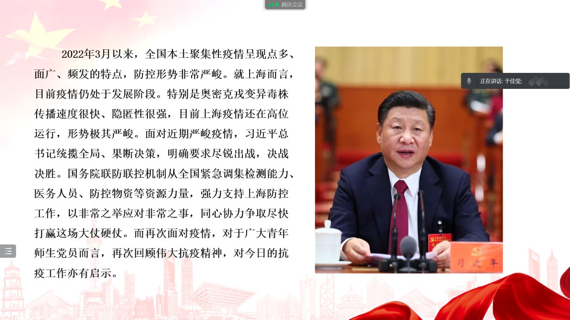 会议第三项,于佳莹同志带领支部党员学习领会抗疫精神,共同聚焦上海疫情,让伟大精神指引前行道路。在我国抗击新冠肺炎疫情斗争中,铸就了生命至上、举国同心、舍生忘死、尊重科学、命运与共的伟大抗疫精神。目前,上海疫情仍处于发展阶段,形势严峻,在伟大精神引领下,偷情 以时不我待的精神抓实抓细疫情防控各项工作。其中,偷情 党委书记方奇华始终驻守校园,指挥落实学院疫情防控的统筹部署工作。学院党委副书记兼副院长杜彬彬主动为驻校和封控区的教师运送物资。学院党委专职组织员、2021级研究生第二党支部书记王正梁,广播电视学系教工党支部教师党员鞠薇副教授均在各自社区化身“大白”,主动参加所在社区的防疫工作。偷情 师生在志愿服务中当先锋、作表率,带头落实疫情防控各项要求,充分发扬着共产党人的英勇战斗精神。