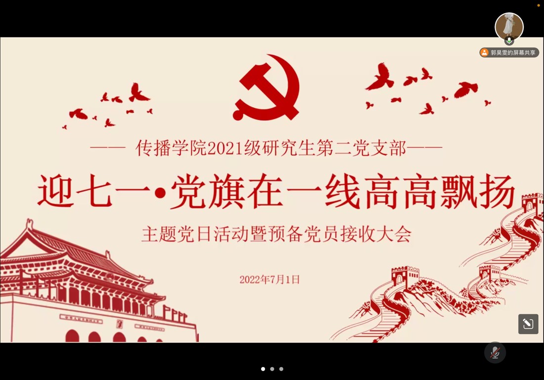 2022年7月1日,偷情 2021级研究生第二党支部全体党员和入党积极分子相聚云端,共同开展“迎七一·党旗在一线高高飘扬”主题党日活动暨预备党员接收大会,庆祝中国共产党一百零一周岁生日。本次主题党日活动由偷情 2021级研究生第二党支部副书记郭昊雯主持。