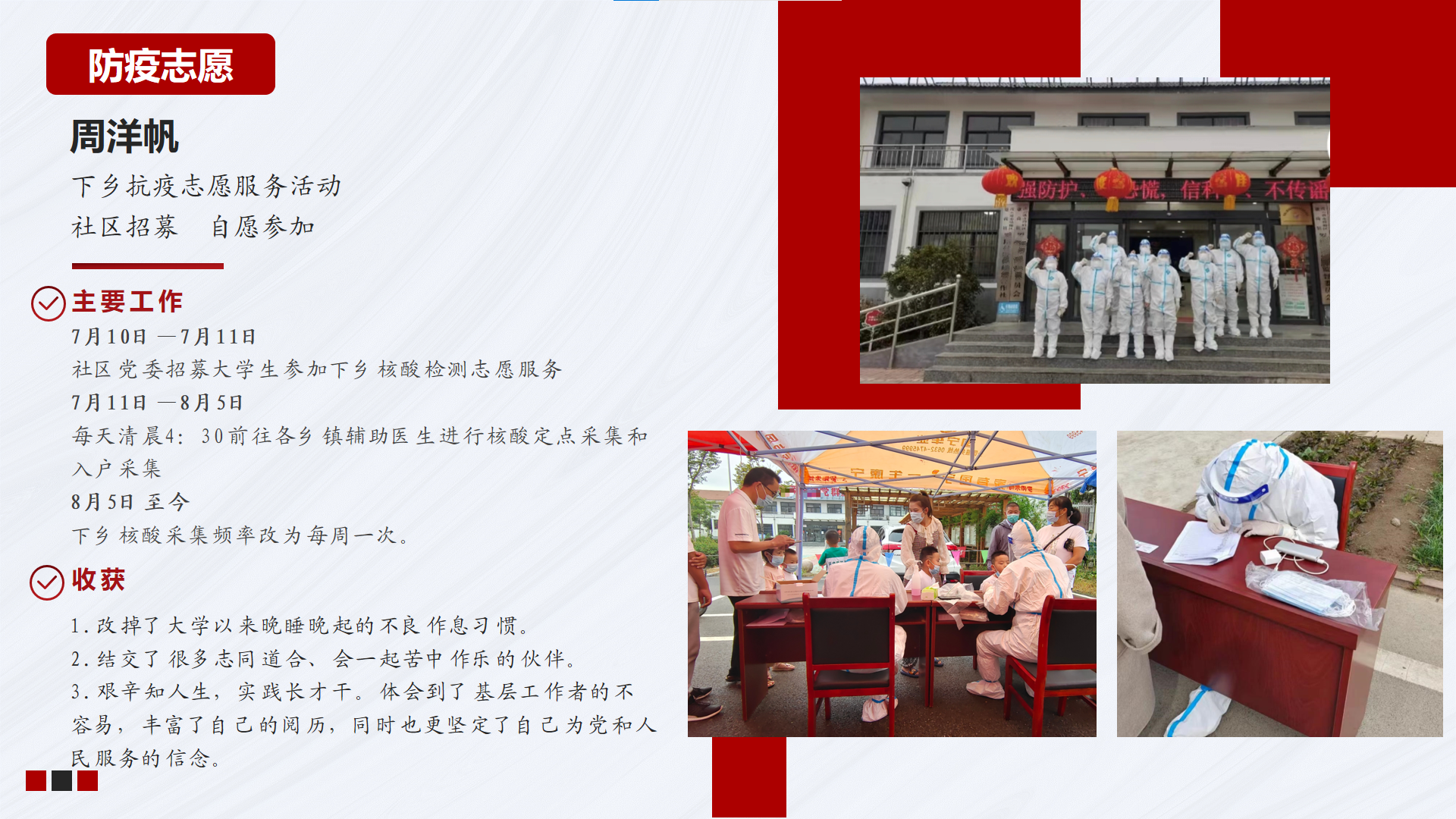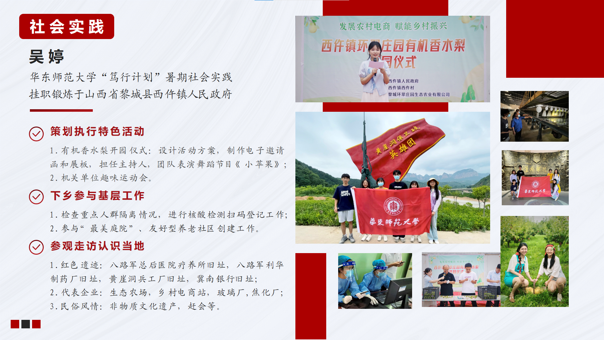 吴婷同志则参与了偷情 “阡陌笃行计划”暑期社会实践活动,前往山西省黎城县西仵镇人民政府进行三周挂职锻炼。她带领实践团队为当地特色农产品策划与执行开园仪式,以精彩纷呈的活动现场助力乡村振兴。此外,下乡服务基层,日常核酸检测,走访红色遗迹与代表企业亦是其丰富的工作内容。