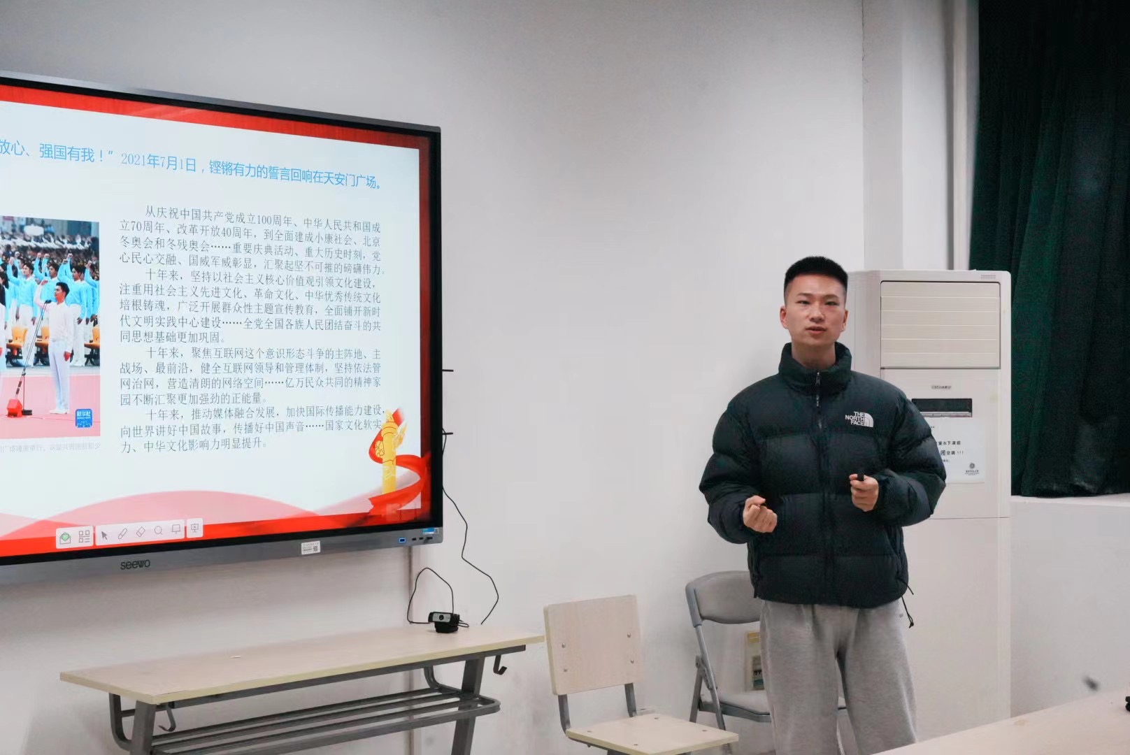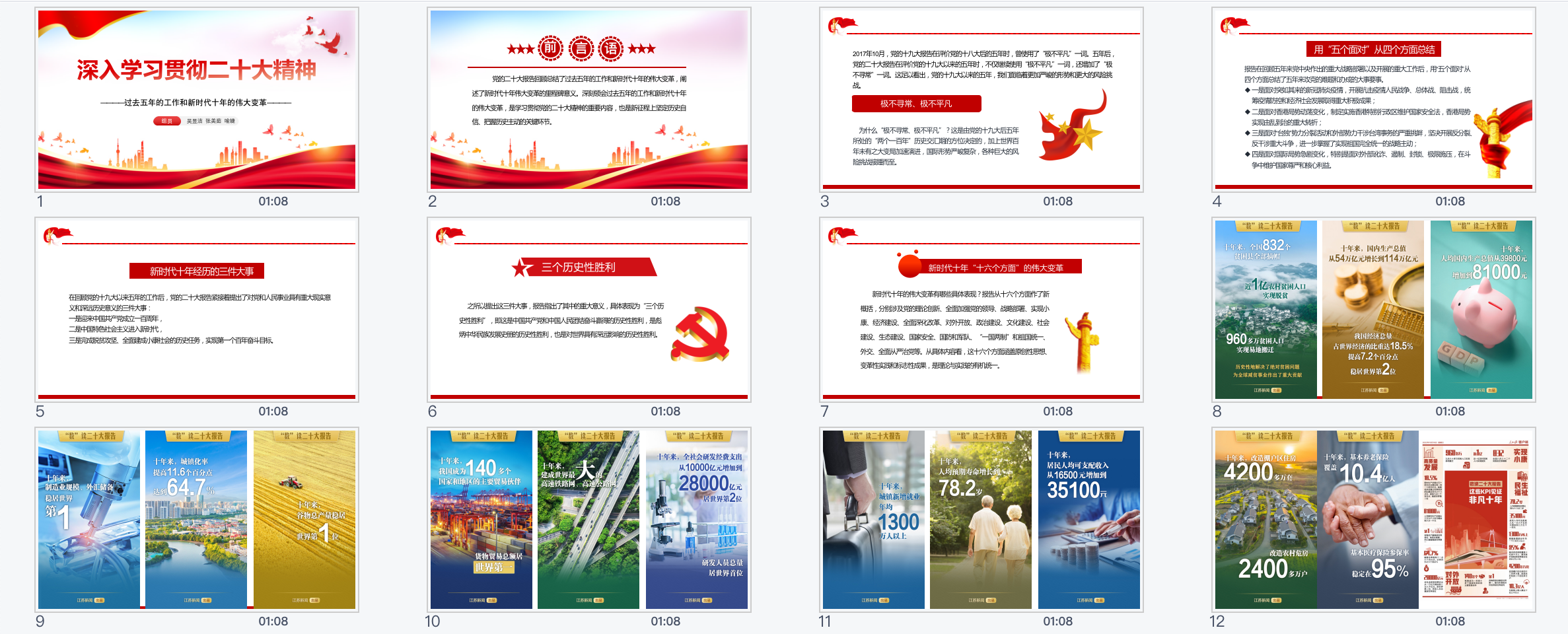 第一小组首先用多个关键词回顾了二十大报告原文的第一部分,用多组数据梳理归纳了报告中“极不寻常、极不平凡”过去五年的工作和新时代十年“十六个方面”的伟大变革。之后,小组又将理论与实际相结合,用一组组数字海报展示出新时代十年来我国在各领域取得的成绩。