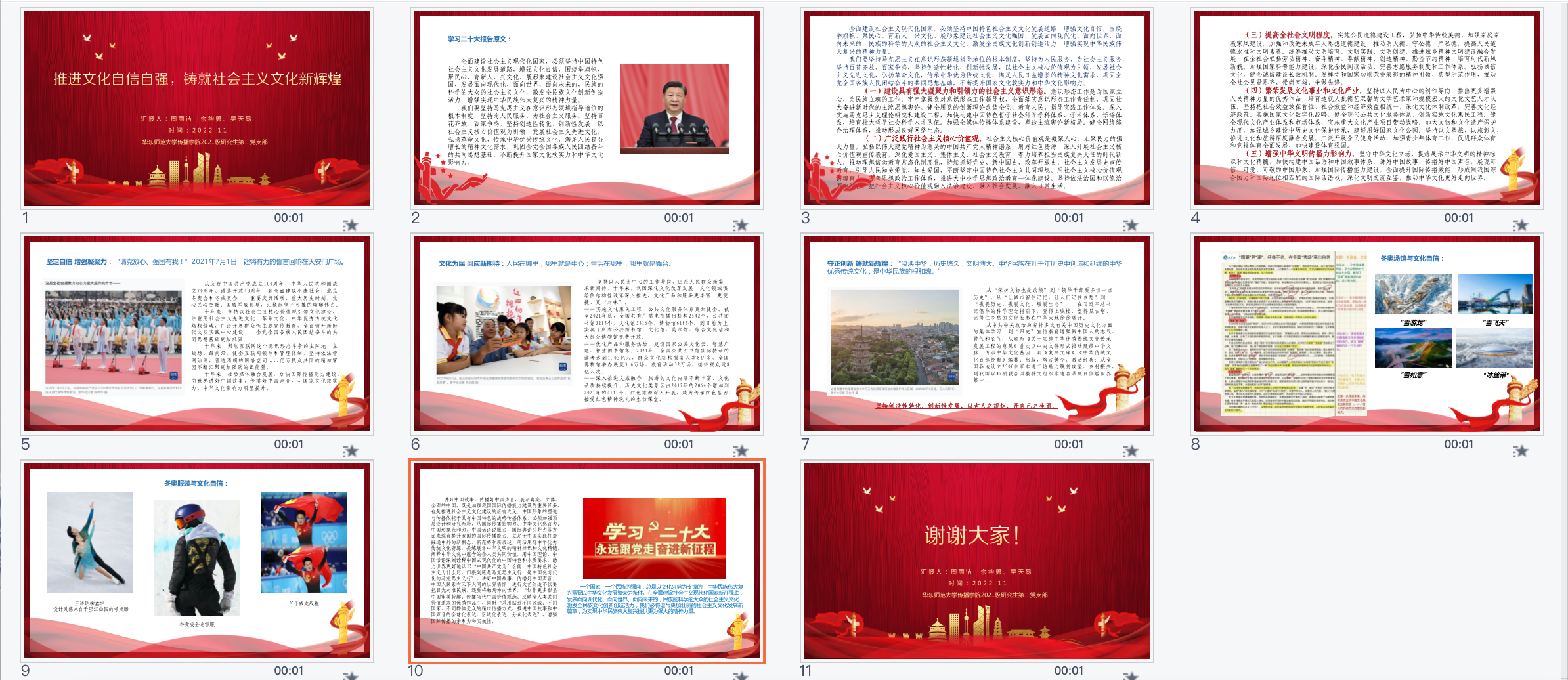 第八小组在解读了二十大报告原文之后,立足“坚定自信,增强凝聚力”、“文化为民,回应新期待”、“守正创新,铸就新辉煌”三个层面,结合多个事例介绍了近年来文化自信在全社会各领域中的生动体现。最后,该小组认为传播学子要将“讲好中国故事,传播好中国声音”作为己任,我们青年一代必将谱写更加壮丽的社会主义文化发展新篇章,为实现中华民族伟大复兴提供更为强大的精神力量。