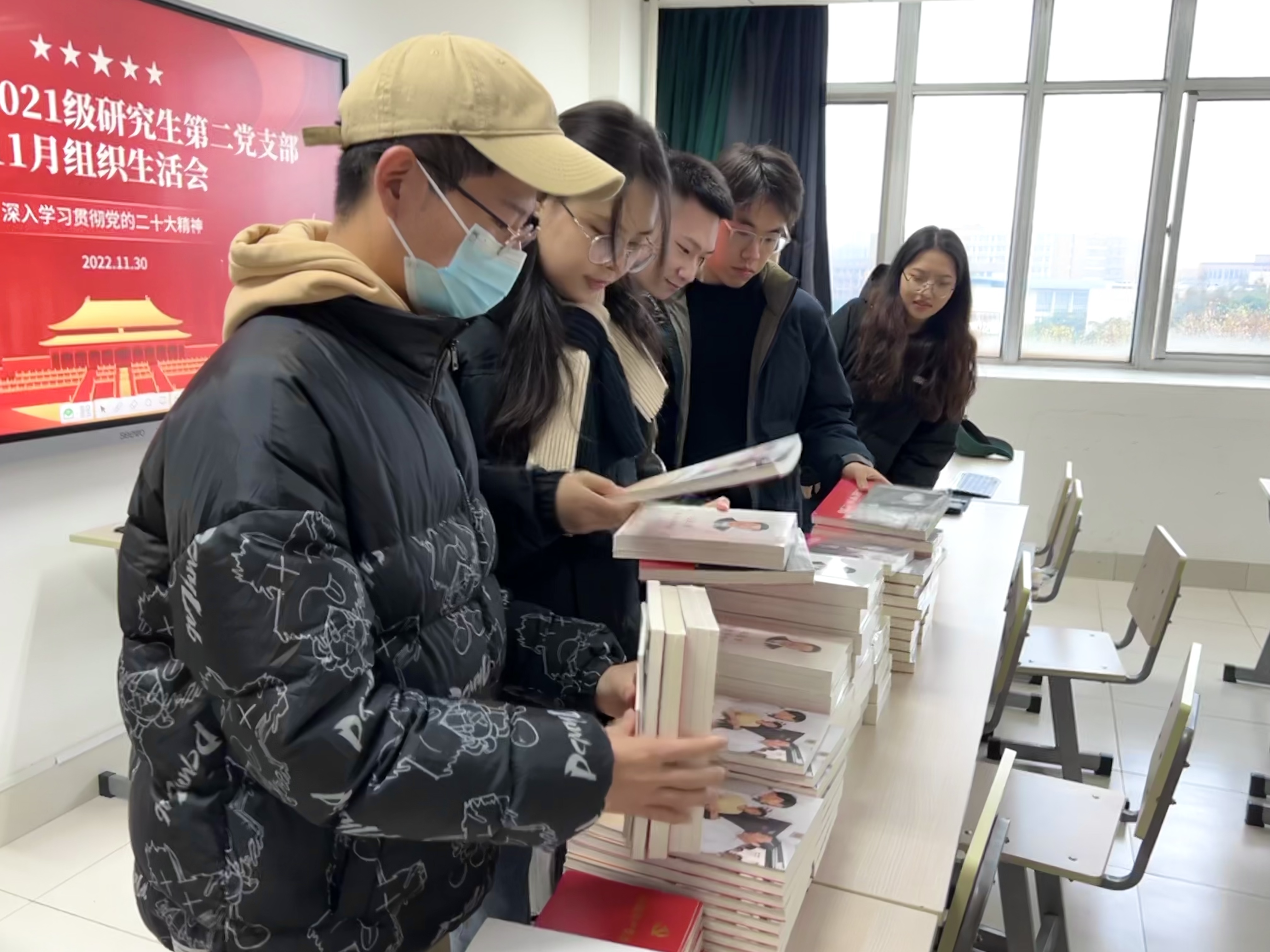 会议开始前,每位党员领取了《中国共产党章程》、《习近平谈治国理政》第四卷、《习近平在上海》等五册学习用书。沉甸甸的书籍承载着学院党委对于各位党员同志的希望,希望各位党员能够在深学细悟理论知识中勇毅前行,在新时代新征程中作出更大贡献。
