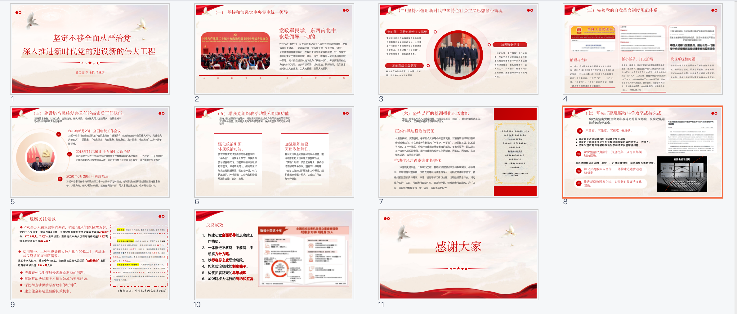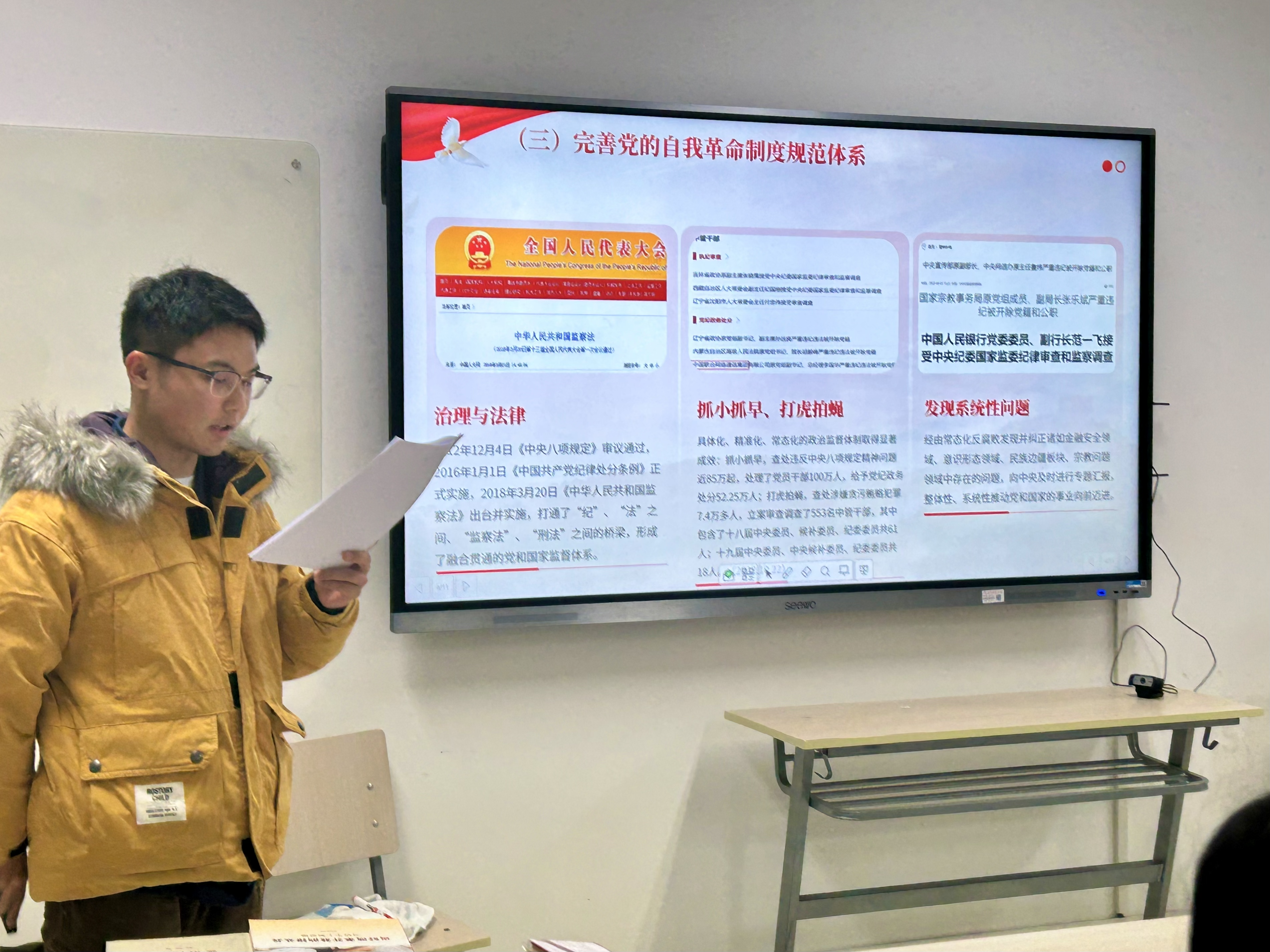 第十五小组结合“从严治党”的关键词,从七个方面梳理了推动新时代党的建设的举措方法,并引用习近平总书记在十八届中共中央政治局第一次集体学习上所讲:“只有讲政治、讲对政治、讲好政治,我们党才能时刻从人民出发、为人民着想、赢得人民拥护。”在分享的尾声,小组重点关注了我国反腐领域近年来的动态与成效,强调了我国加强新时代廉洁文化建设的决心。