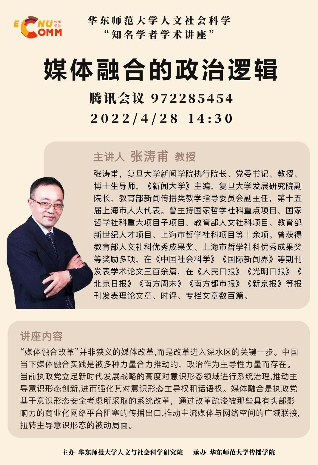 张涛甫,复旦大学新闻学院执行院长、党委书记、教授、博士生导师,《新闻大学》主编,复旦大学发展研究院副院长,教育部新闻传播类教学指导委员会副主任,第十五届上海市人大代表。曾主持国家哲学社科重点项目、国家哲学社科重大项目子项目、教育部人文社科项目、教育部新世纪人才项目、上海市哲学社科项目等十余项。曾获得教育部人文社科优秀成果奖、上海市哲学社科优秀成果奖等奖励多项,在《中国社会科学》《国际新闻界》等期刊发表学术论文三百余篇,在《人民日报》《光明日报》《北京日报》《南方周末》《南方都市报》《新京报》等报刊发表理论文章、时评、专栏文章数百篇。