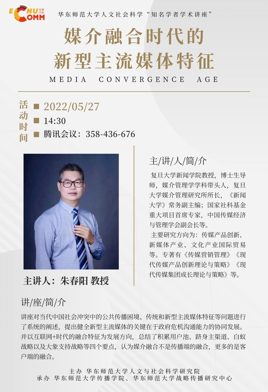 朱春阳,复旦大学新闻学院教授,博士生导师,媒介管理学学科带头人,复旦大学媒介管理研究所所长,《新闻大学》常务副主编;国家社科基金重大项目首席专家,中国传媒经济与管理学会副会长等。