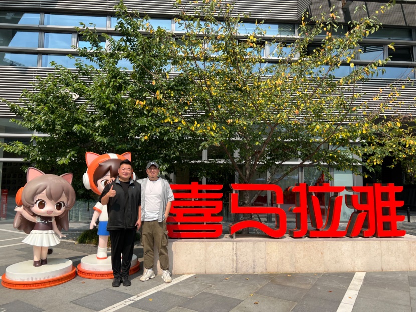 杨燊与播音与主持艺术专业马力老师在喜马拉雅logo前合照