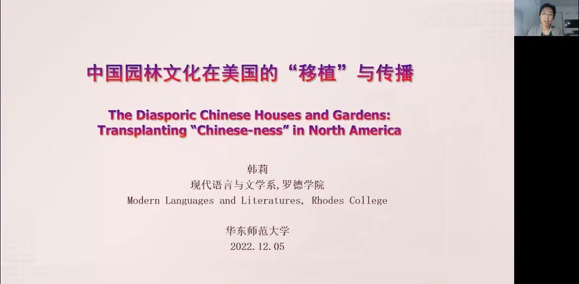 2022年12月5日晚,美国罗德学院现代语言与文学系副教授韩莉老师以“中国园林文化在美国的‘移植’与传播”为主题展开线上讲座。讲座分别介绍了在美国的三个中国园林和由中国挪移到美国的荫余堂,并通过分析媒体呈现,来探讨“中国(性)”在北美的“移植”与传播。 偷情 院长王峰担任本次会议主持人,数百位专家学者和学生在线参与。