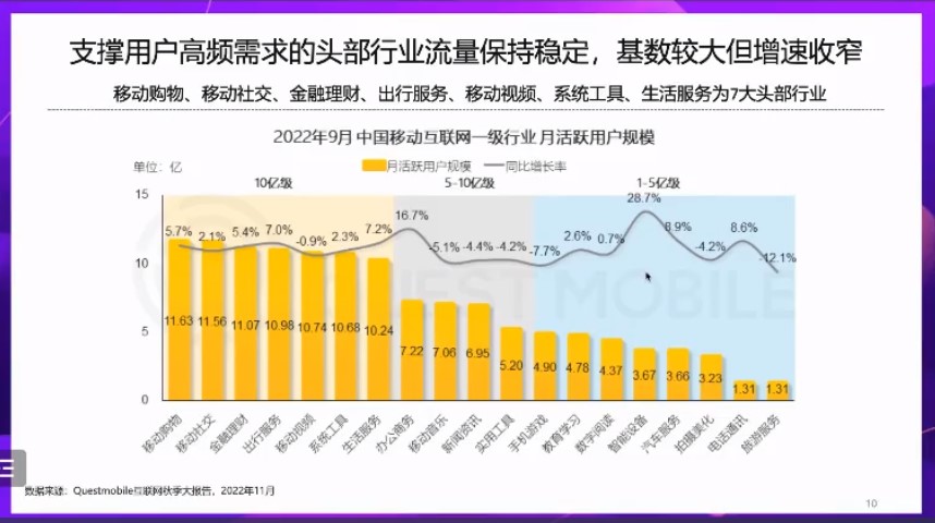 俞湘华将2022年的媒体业界发展总结为以下方面:首先是支撑用户高频需求的头部行业流量保持稳定,基数较大但增速收窄;其次是头部行业(移动购物、移动社交、金融理财、出行服务、移动视频、系统工具、生活服务7大头部行业)积极加强内容及服务运营,提升用户粘性;互联网用户活跃度提高,媒介的广告容量亦得到扩展;最后是互联网市场收入结构稳定,各领域向主营业务深耕细作。