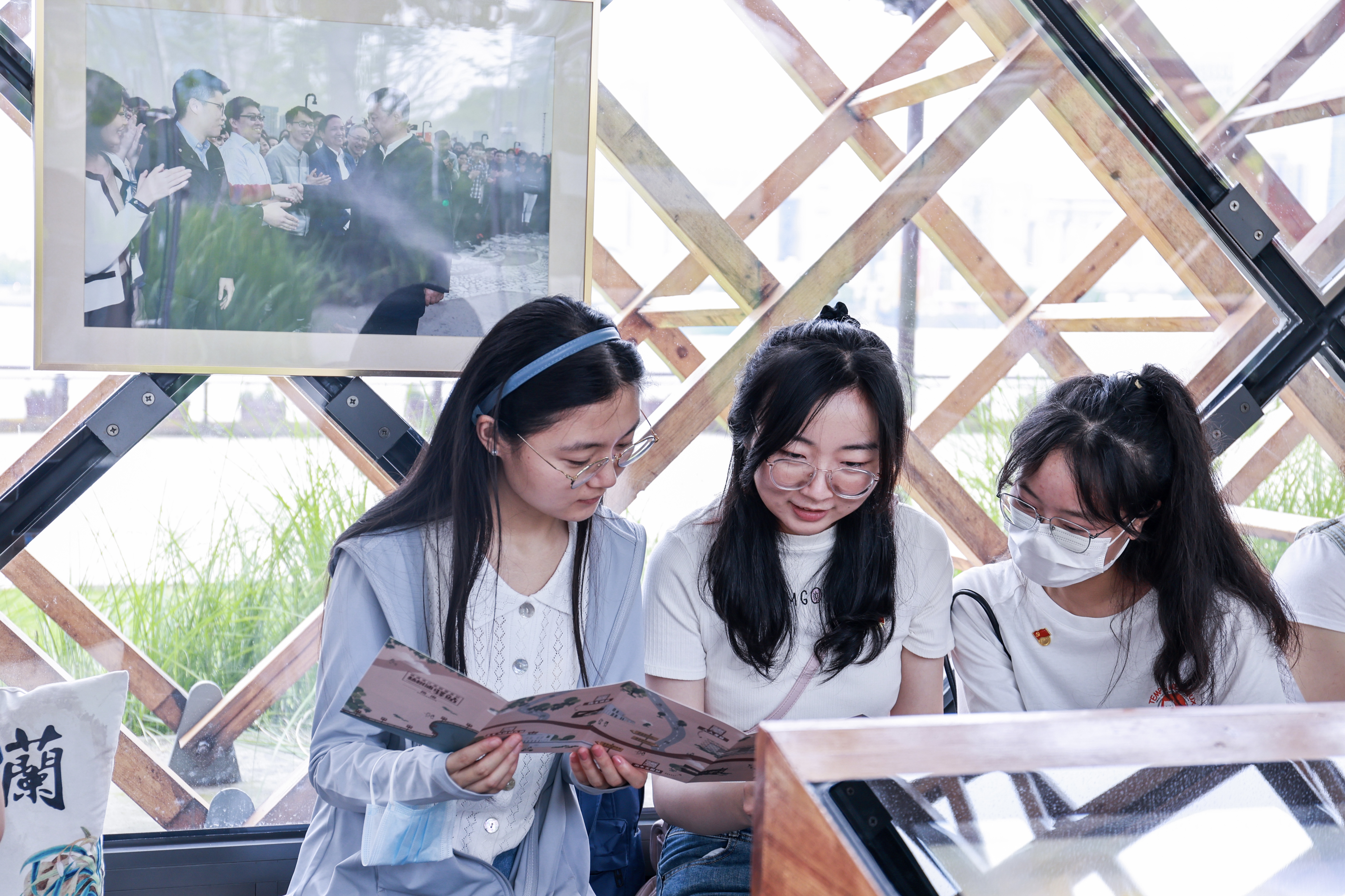一路行至1915年英商怡和纱厂旧址,见一处低洼低地便是雨水花园,其周边栽种着各式各样的水生植物,用于就地消纳雨水、调节微气候,是一种生态可持续的雨洪控制与雨水利用设施。在讲解员的带领下,党员们还学习了雨水花园所融合的“海绵城市建设”概念以及“东方渔人码头”的设计理念,进一步了解杨浦滨江“还江于民”所作的努力。