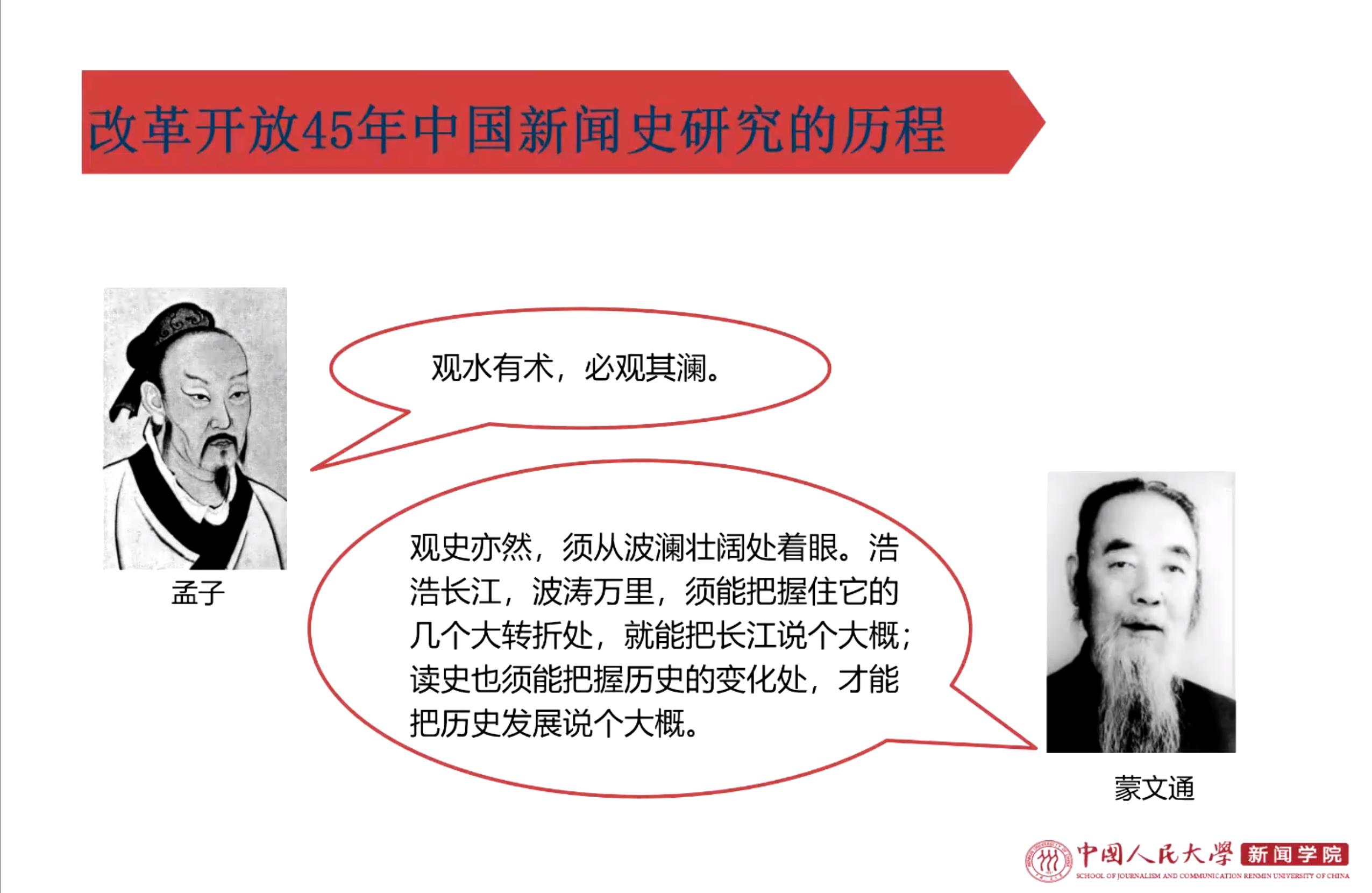 讲座伊始,邓绍根指出,改革开放40年来,党引领人民绘就了波澜壮阔的历史画卷,而新闻史的学术研究也随之发生了根本性变化。他认为,从研究价值的角度来说,从新闻史角度回顾十一届三中全会提出的改革开放政策很有必要,因为这是中国历史的变化之处,只有看到历史的转折,才能大概了解历史的发展,这正应了孟子所说的“观水有术,必观其澜”。