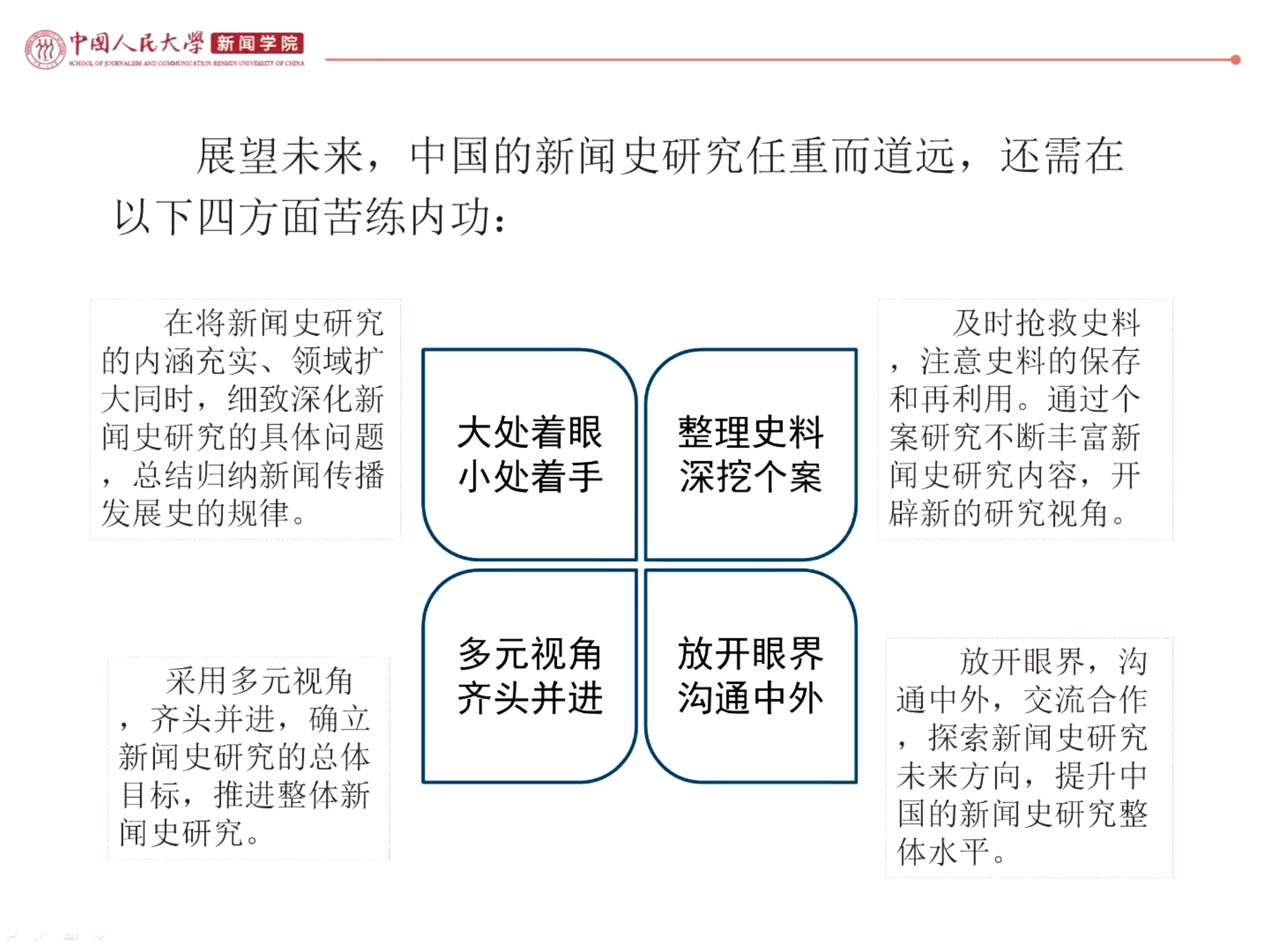 总之,邓绍根认为改革开放的这45年,不仅是中国新闻史研究者不断解放思想、锐意进取、开拓创新的45年,也是新闻史研究受国家资助力度最大、涌现成果最多、社会反响最好的45年,一个以时间、空间为轴,多维度、全方位、立体式的研究新格局正式形成。