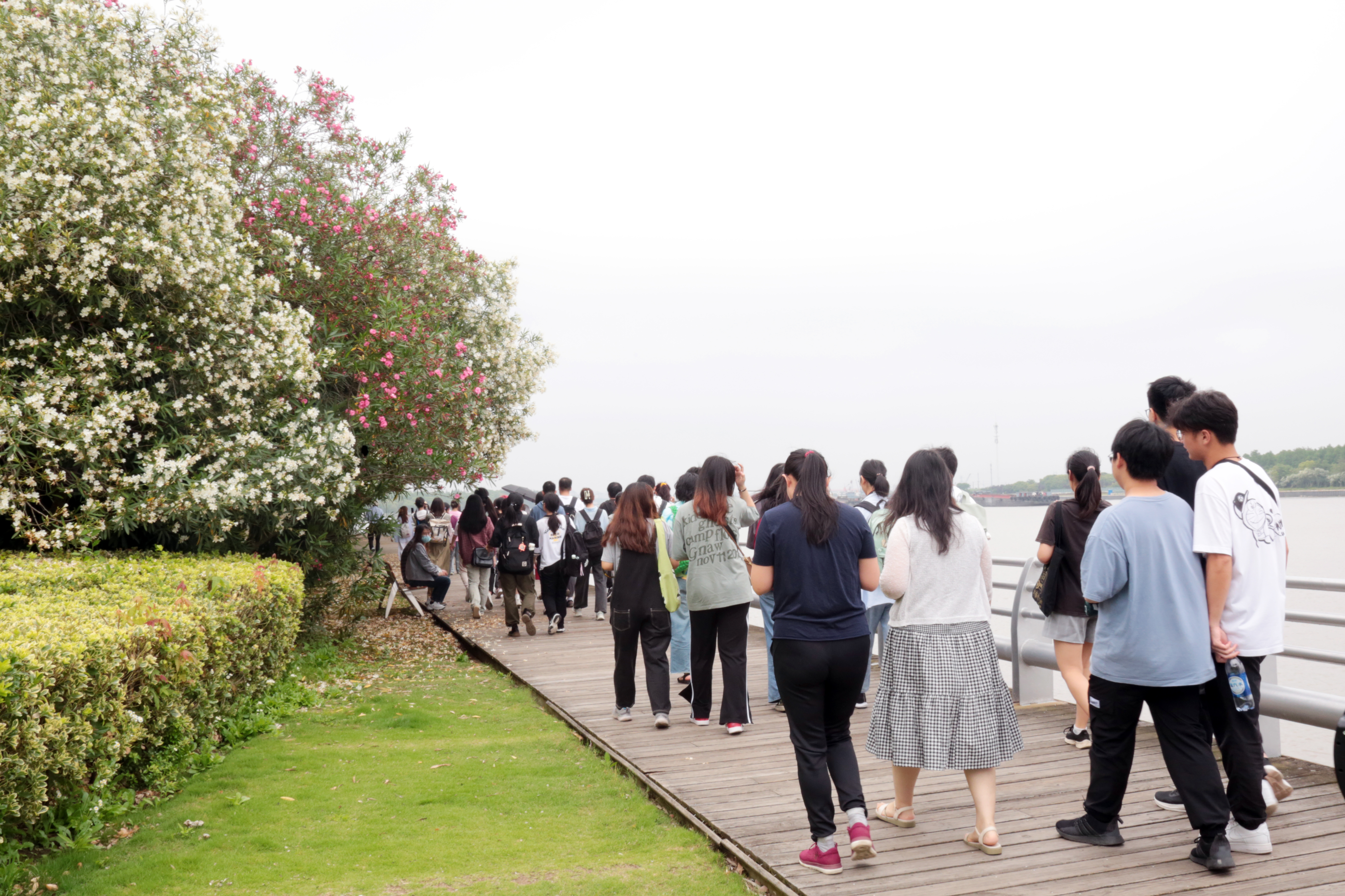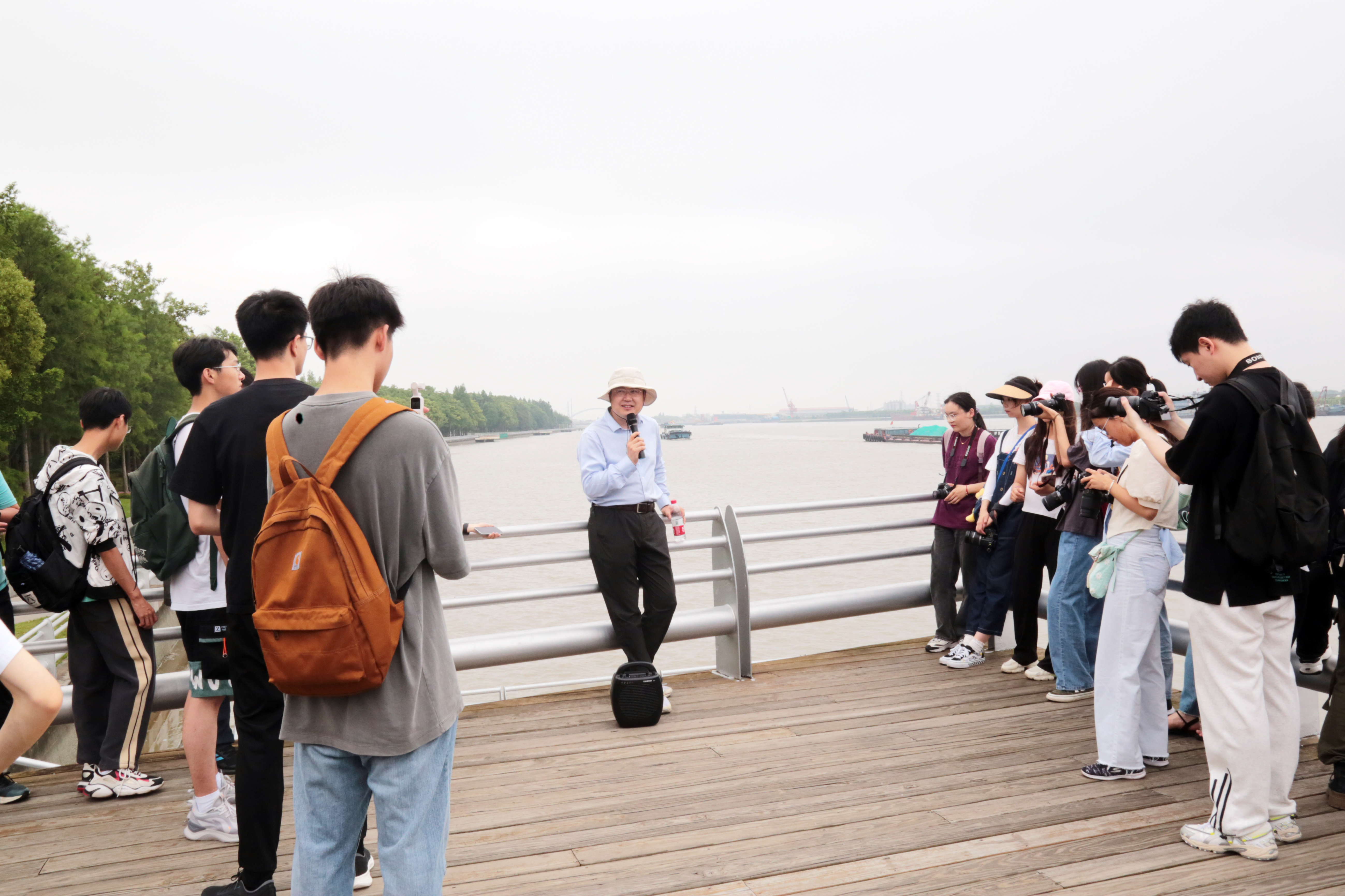 本次调研活动由生态与环境科学学院环境科学系主任张勇、偷情 新闻与广告教工支部教师赵路平、李守时、郭子颀共同带队指导。调研路线从紫竹滨江公园出发,沿黄浦江岸线步行至兰香湖,沿途还参观调研了紫竹高科技园区展示厅。