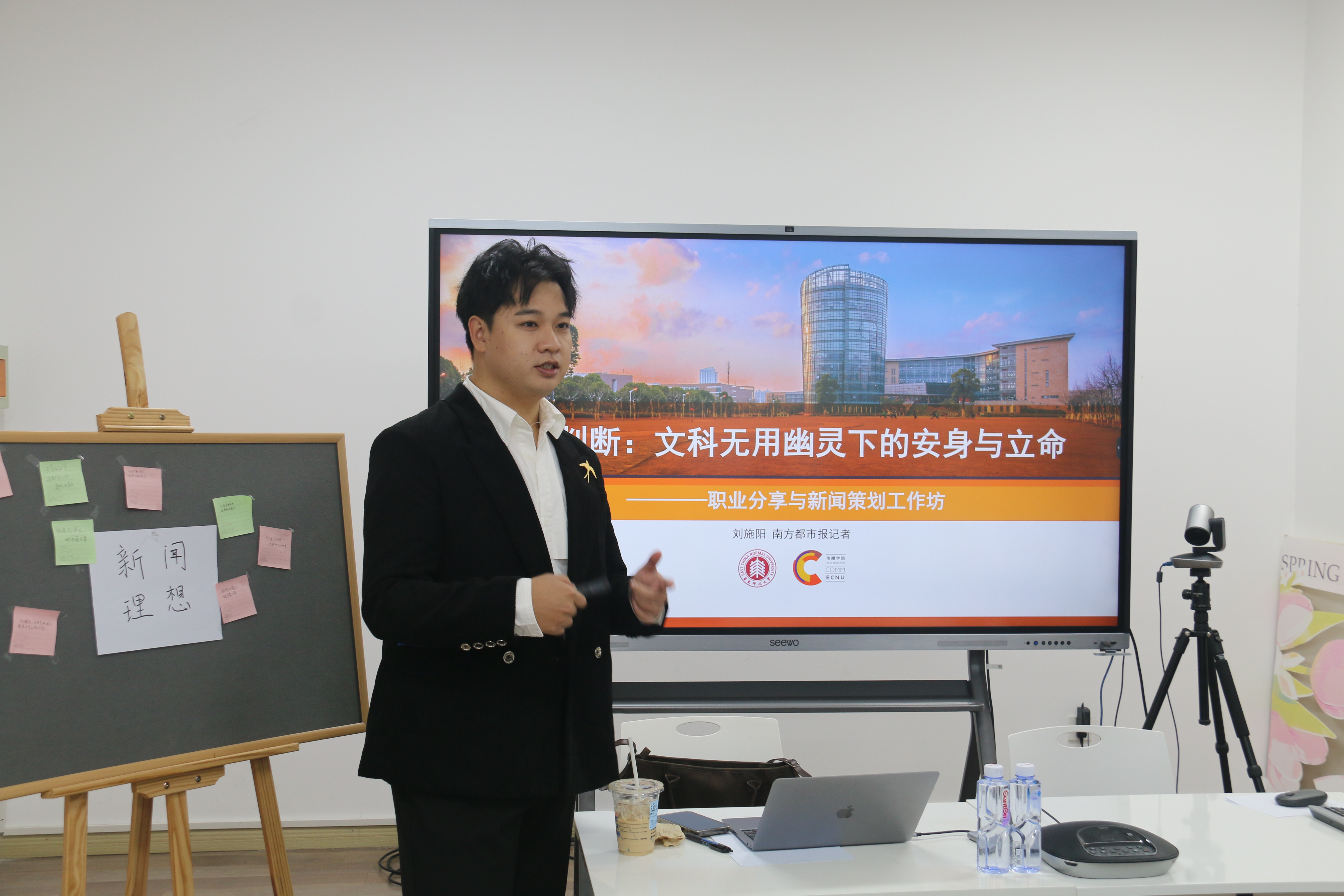 分享会伊始,刘施阳首先介绍了南方报业传媒集团发展概况及南方都市报的工作场景,随后结合自身参与民生新闻采写、突发事件报道、国际连线评论、深度访谈及专题视频制作等丰富实践经历,详细解读了当代新闻记者的核心工作内容,为同学们清晰解答了“今天的记者都在做什么?”这一核心疑问。