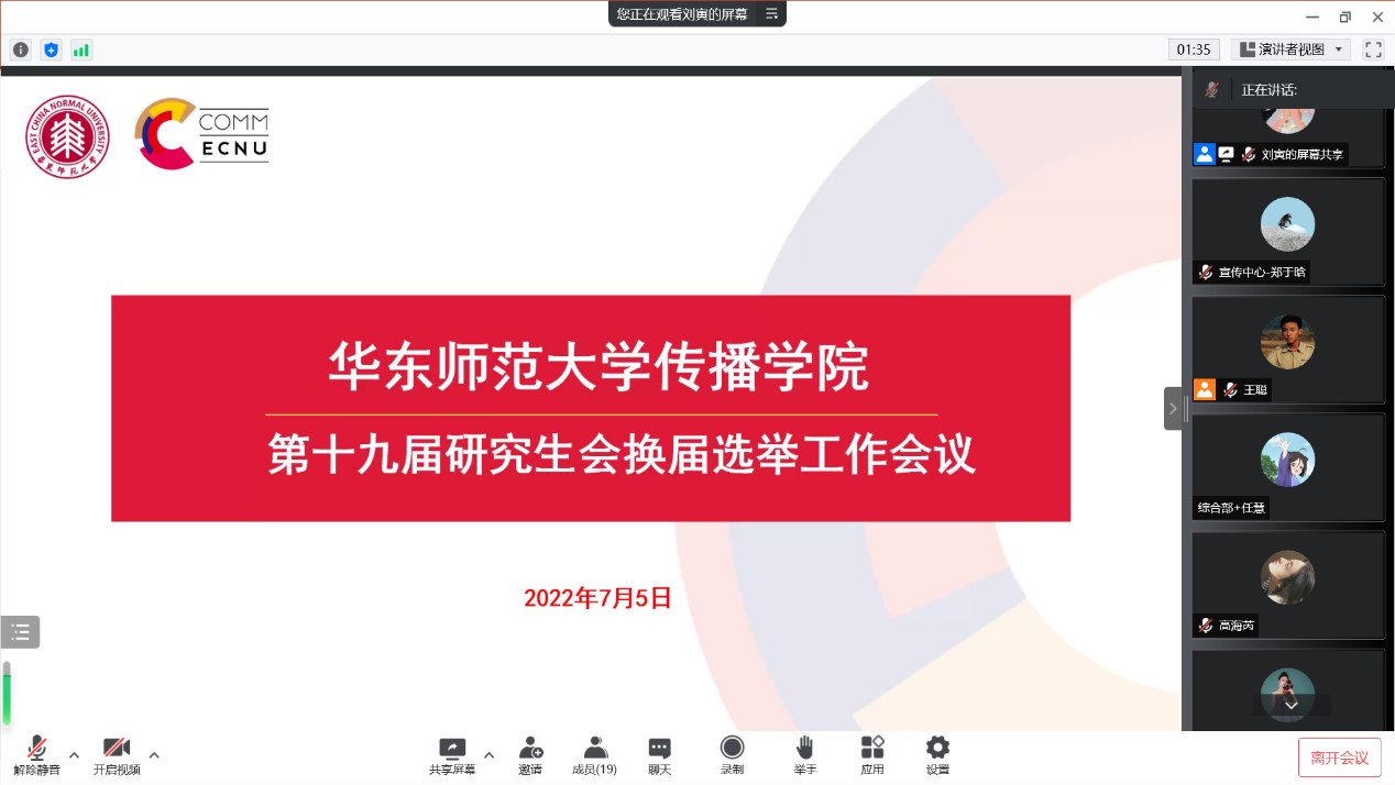 2022年7月5日上午10点, 偷情 第十九届研究生换届选举工作会议以线上形式召开,偷情 团委书记吴烨茜老师、偷情 第十八届研究生会全体成员及各班学生代表出席了本次会议。工作会议由偷情 第十八届研究生会主席团成员王聪主持。