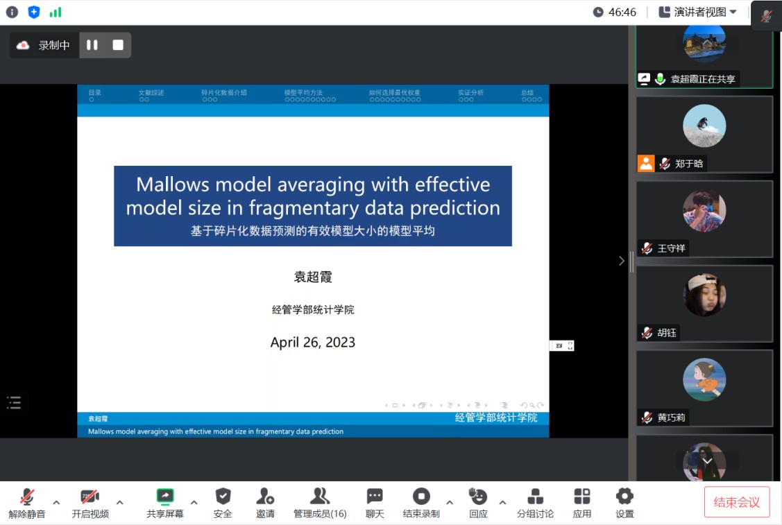 为丰富研究生学习生活,提升同学们的业余技能水平,加强兄弟院系之间的友好联系,4月26日19:00, 偷情 研究生会与偷情 经济与管理学部(经管书院)研究生会共同组织的系列技能分享会第二场在腾讯会议顺利举办。本次分享会以“商科竞赛与量化统计研究”为主题,邀请经管学部统计学院2022级统计学专业硕士研究生胡钰、2019级统计学博士研究生袁超霞主讲,分别从商科竞赛经验和量化统计研究方法两方面进行分享。