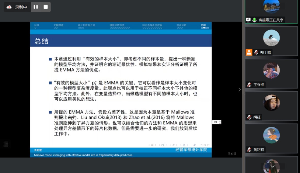 接着,袁超霞同学结合实例介绍了碎片化数据的概念,并指出对于碎片化数据来说,线性模型平均方法能够对其有效进行模型拟合。随后,袁超霞同学详细讲解了在基于协变量和样本量之间的权衡选择候选模型的基础上,如何通过拟合K个候选模型、预测模型平均估计量、选择最优权重等步骤进行实证分析,从而实现基于碎片化数据进行条件期望预测的目标;同时也通过不同方法的比较,证明了模型平均方法在分析碎片化数据方面的优势,为同学们量化统计研究提供了新的思路。答疑环节中,胡钰同学和袁超霞同学则围绕模型平均方法的应用范围和展开进一步讨论,在思想火花的交流与碰撞中展现量化研究方法的统计学魅力。