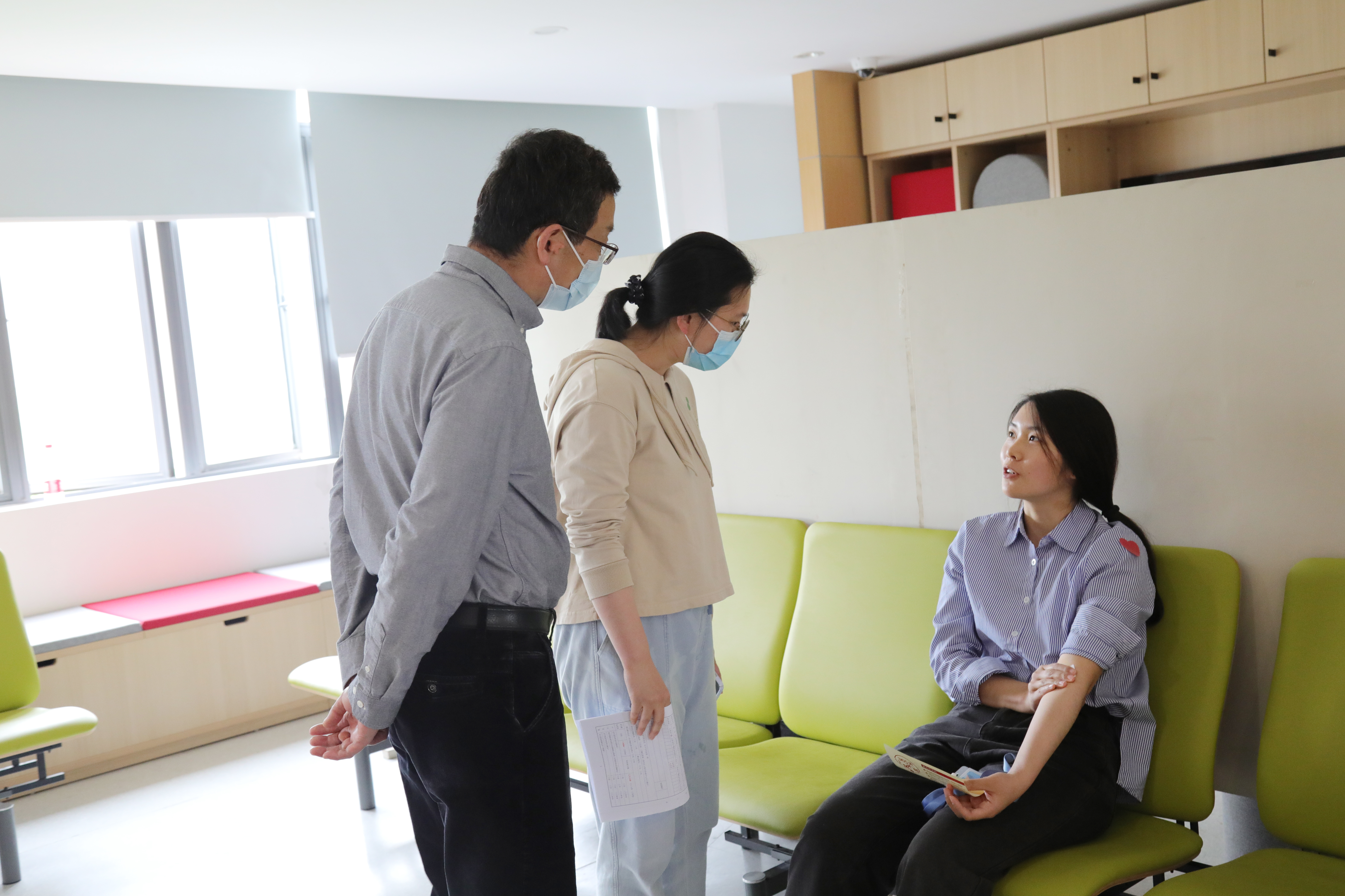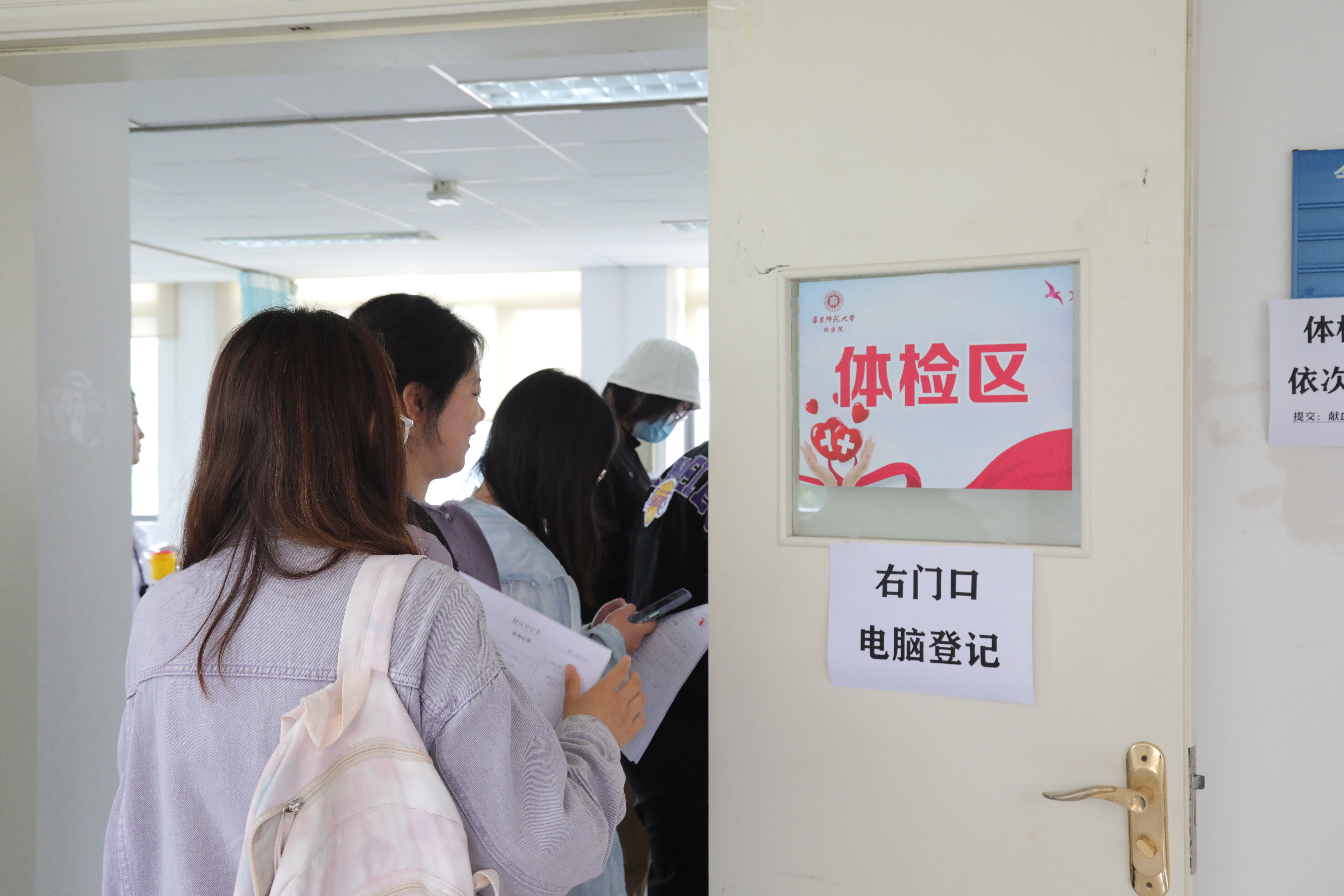 5月12日下午12:30,校医院献血通道开启,传院学生陆续来到了一楼大厅等待献血。一楼为检查身高体重区域,同学们在此测量身高体重,之后来到二楼进行献血登记表审核。在二楼,工作人员会耐心询问同学近况,进行血型测试、血压测量等,以确保同学们近期的身体状况符合献血条件。在一系列检查完成后,同学们即可到四楼采血处等待采血。