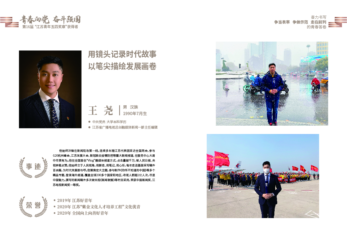 “江苏青年五四奖章”是共青团江苏省委、江苏省青年联合会授予江苏优秀青年的最高荣誉,旨在树立政治进步、品德高尚、贡献突出的青年典型。今年是中国共产党成立100周年,是开启全面建设社会主义现代化国家新征程、向第二个百年奋斗目标进军的起始之年,当代青年生逢其时、重任在肩。