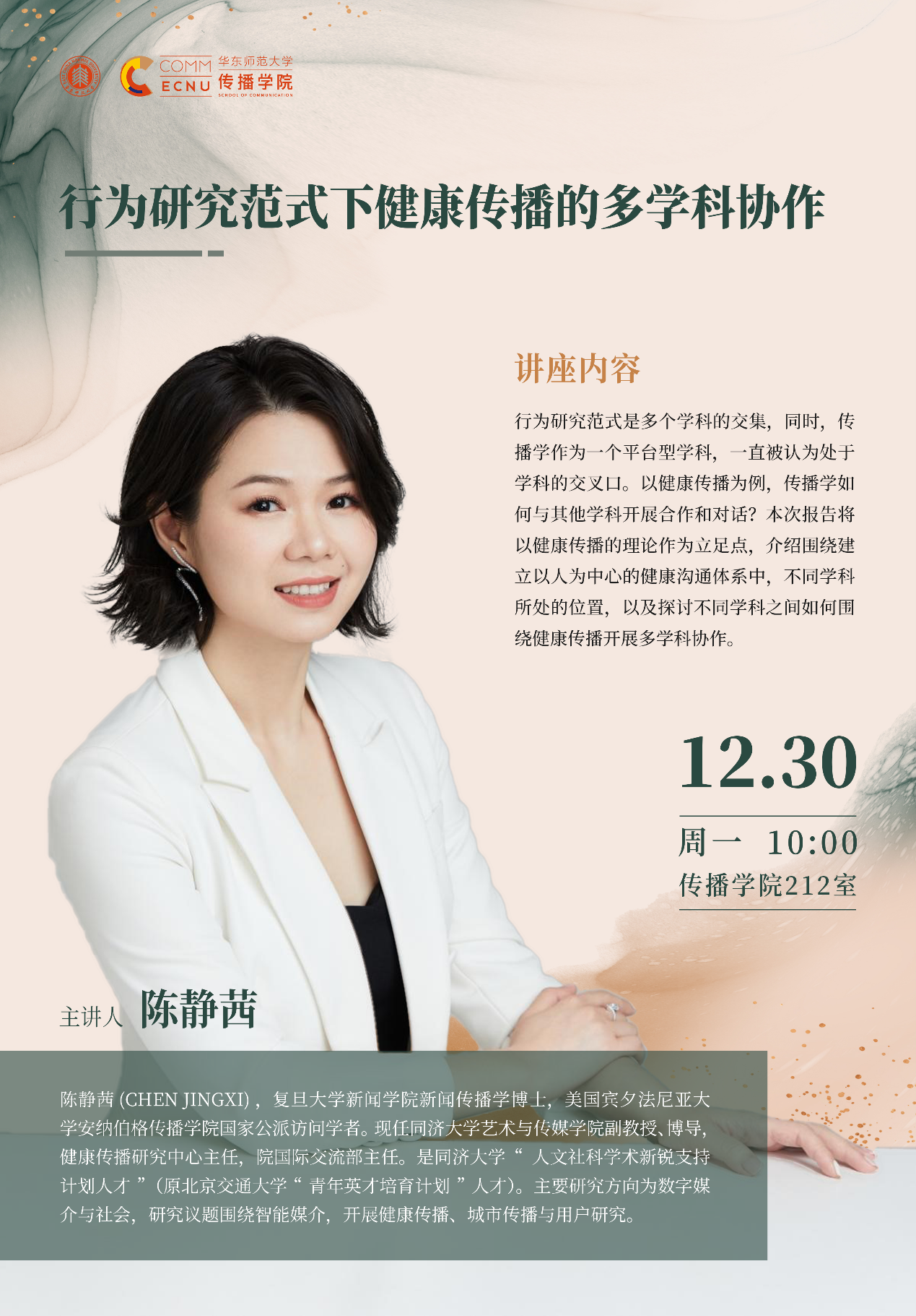 行为研究范式是多个学科的交集,同时,传播学作为一个平台型学科,一直被认为处于学科的交叉口。以健康传播为例,传播学如何与其他学科开展合作和对话?本次报告将以健康传播的理论作为立足点,介绍围绕建立以人为中心的健康沟通体系中,不同学科所处的位置,以及探讨不同学科之间如何围绕健康传播开展多学科协作。