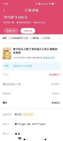 基于之前的经验,她在小红书上寻找可靠的票务信息,最终选定了一个看似正规的票务代理。这位票务代理的朋友圈显示,他从2024年年初开始从事票务工作。5221710分,凯丽将自己的身份证号、地址信息发送给黄牛票务。在对方“无需预付定金,不着急,只需确定录入成功再付款”和“以免说我是骗子”的诱惑下,凯丽更加确定这次是碰上了好运气,决定通过他购买两张门票,共2814元。