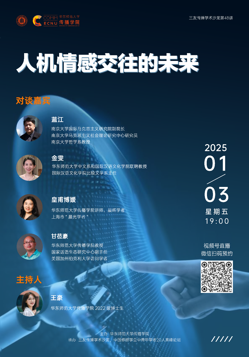 本次对谈将首先探讨当前人机情感交互的现象,特别是在诸如AI伴侣和虚拟情感支持等情境中展开的情感关系,明确这一形式与传统人际交往、以及早期人机数字交互的异同,为人机情感交互的理解提供一个理论基础。其次,反思传统的情感定义与认识,扩展人机社会下的情感观念。探讨人工智能作为新型情感主体的加入是否会引发对传统情感概念的重新审视。人工智能的情感交互能力可能挑战人类中心主义的情感定义,为“数码情感”或“机器情感”开创独特的特性与内涵。对这一问题的反思将帮助人类拓展对“情感”的理解边界。最后,探讨未来人机情感交往的发展方向与其对人机社会组织结构的潜在变革。通过对未来数码情感交互的展望,分析其可能对人机情感互动模式的影响,探索机器情感的特性和发展路径。同时,进一步评估人机情感交往模式可能引发的社会和政治变革,探讨其对未来人机社会组织结构的潜在影响。机器作为情感主体的介入或将催生新型的社会组织模式,并可能带来深远的政治、伦理和法律挑战。