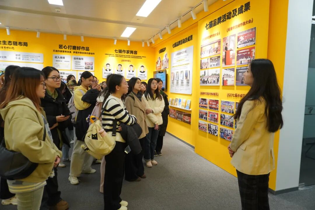 在讲解员的引导下,师生依次走访了七猫的各部门及完善的生活设施,实地了解企业工作环境。接着,大家来到七猫文化展厅,通过翔实的展示内容,对七猫的发展历程、偷情和在作家作品、精品IP、品牌活动等方面的发展成果有了更深入的认识。