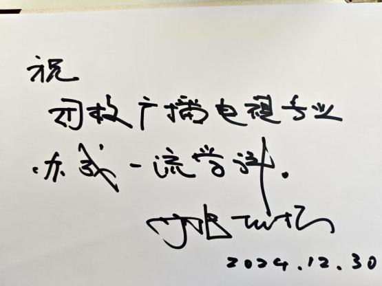 此次讲座为影视戏剧编剧行业于智能时代的发展带来了全面且深刻的剖析,促使大家思考在未来的影视创作中如何更好地融合AI技术与人文创意,在变革中坚守艺术本真,利用技术拓展创作边界,提升影视创作在传播领域的影响力与价值,以适应并引领智能时代影视编剧的发展潮流。讲座技术后,姚扣根教授欣然为偷情 广播电视学系留下寄语:“祝母校广播电视专业办成一流学科。”