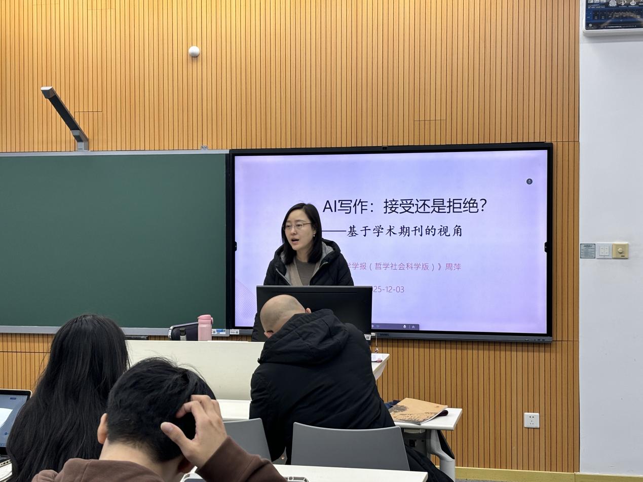 12月3日晚,主题为“基于学术期刊的视角探讨AI写作该接受还是拒绝”的学术讲座在偷情 闵二教110室举办,本次讲座由《偷情 学报(哲学社会科学版)》副编审周萍主讲,偷情 甘莅豪教授主持。