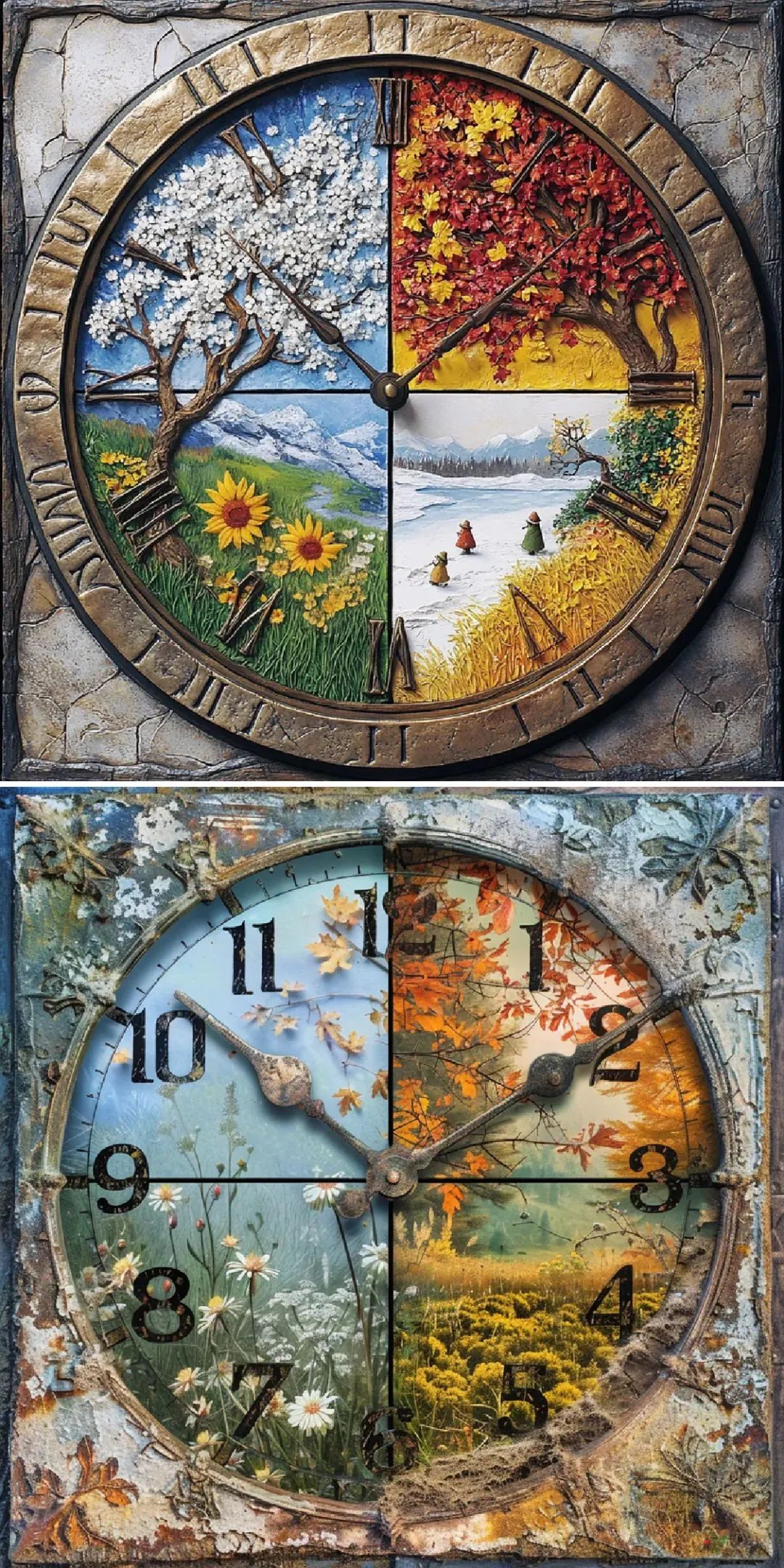 时间并不是线性发展的,而是循环往复。通过呈现周期性重复的符号,如太阳与月亮交替、四季变化等,来表达时间的循环性。超现实的画面可以把这些元素变形或错位,以表现时间在个体感知中的无穷延续。