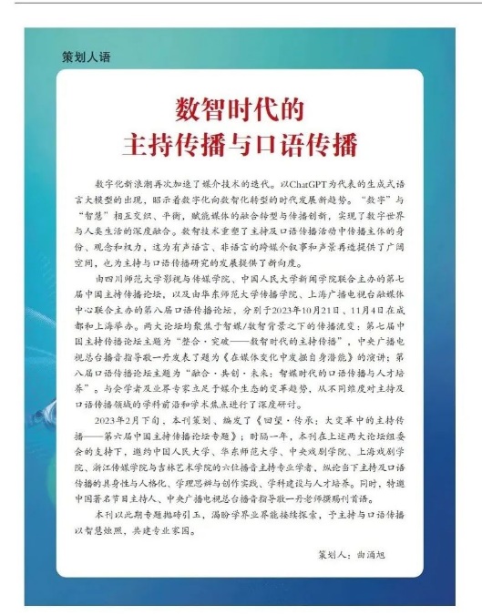 论坛诚邀海内外新闻学、传播学、广播电视学、播音与主持艺术、公共关系学、社会学、政治学、外交学、教育学、汉语言文学、心理学、哲学、逻辑学、人工智能等相关学科领域的专家、学者、青年教师、博士(硕士)研究生以及具有学术研究热情的业界人士积极赐稿、踊跃参与。期待我们在学术探讨和思维碰撞中,为口语传播的智能发展和卓越人才的接续培养注入新活力,融合共创口语传播的美好未来!