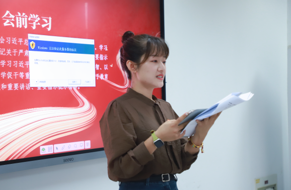 会前,支委会带领与会党员学习领会习近平总书记多篇重要思想、讲话与指示精神,挖掘时事性强、针对性强的理论材料,丰富支部党员的政治学习生活,打好理论基础。支部副书记周雨洁率先讲解了习近平总书记关于党的建设的重要思想,重点介绍了2023年6月的全国组织工作会议中提出的“十三个坚持”。接着,支部组织委员兼任纪检委员左佳结合党的十八大以来习近平总书记在多次会议中的讲话,领学了习近平总书记近十年来关于严肃党内政治生活的重要讲话和重要指示批示精神。支部宣传委员周昱含回顾了支部在之前组织生活中学习的习近平总书记关于以学铸魂、以学增智、以学正风、以学促干等重要论述和关于教育强国的重要讲话精神,带读习近平总书记在教师节致全国优秀教师的信,重点理解了信中所提的“教育家精神”在学生党员间的借鉴意义。此外,周雨洁还结合违反教师职业行为十项准则,剖析反面案例,联系党员自身,举一反三加强党员间警示作用。