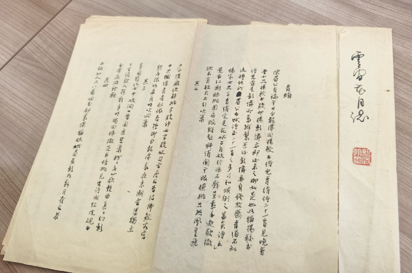 吴彬女士、冯统一先生委托陈子善教授向华东师大档案馆捐赠施先生《云间花月志》毛笔手稿(十四页)