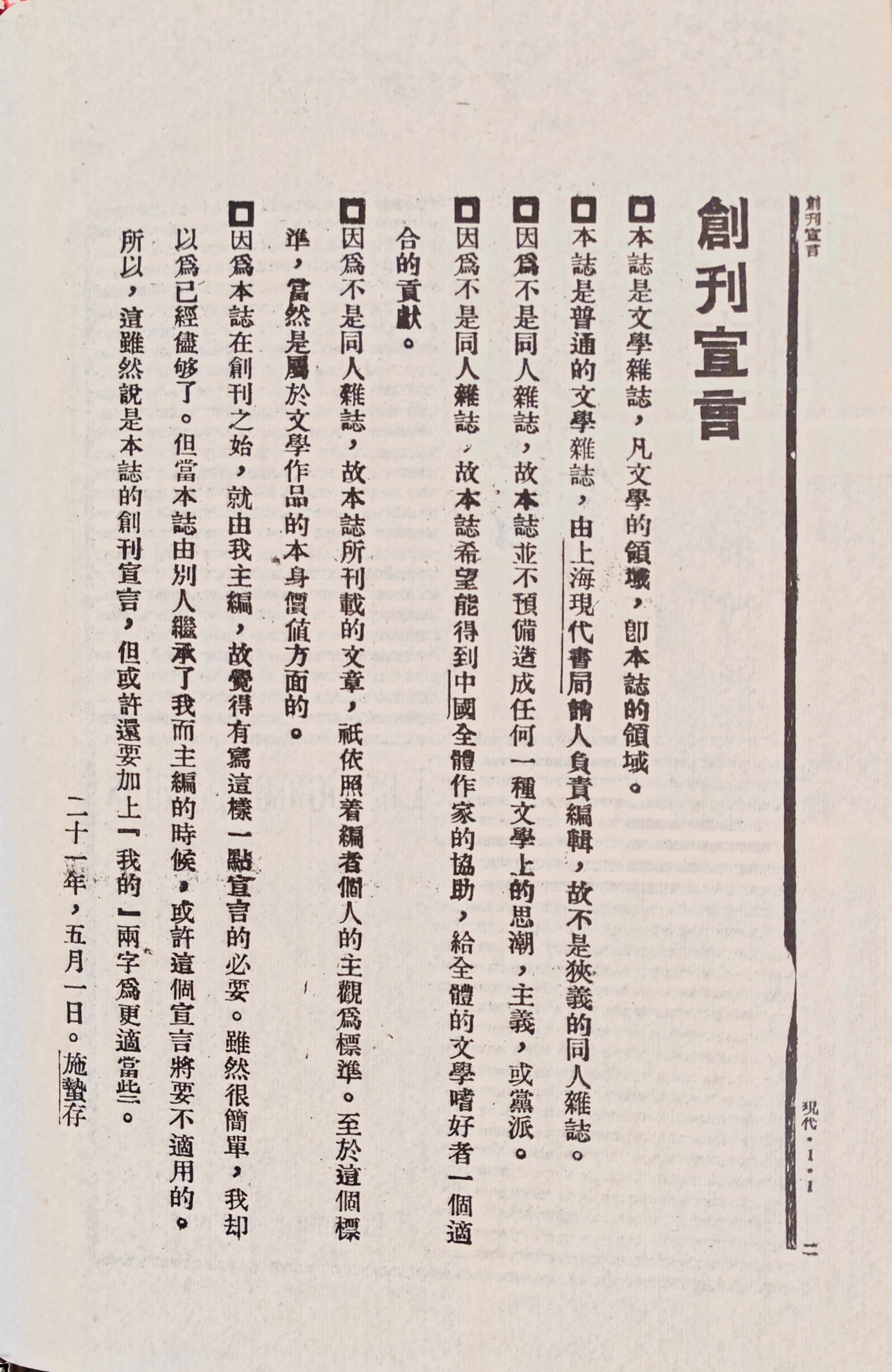 《现代》创刊词