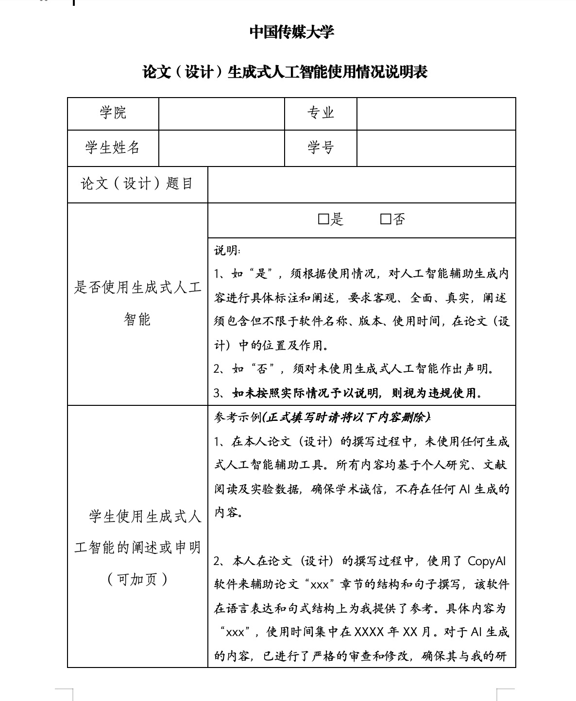 傅雪说,中国传媒大学为了防止学生过度使用AI来写论文,特地向在校学生们发了一份《中国传媒大学论文(设计)生成式人工智能使用情况说明表》。
