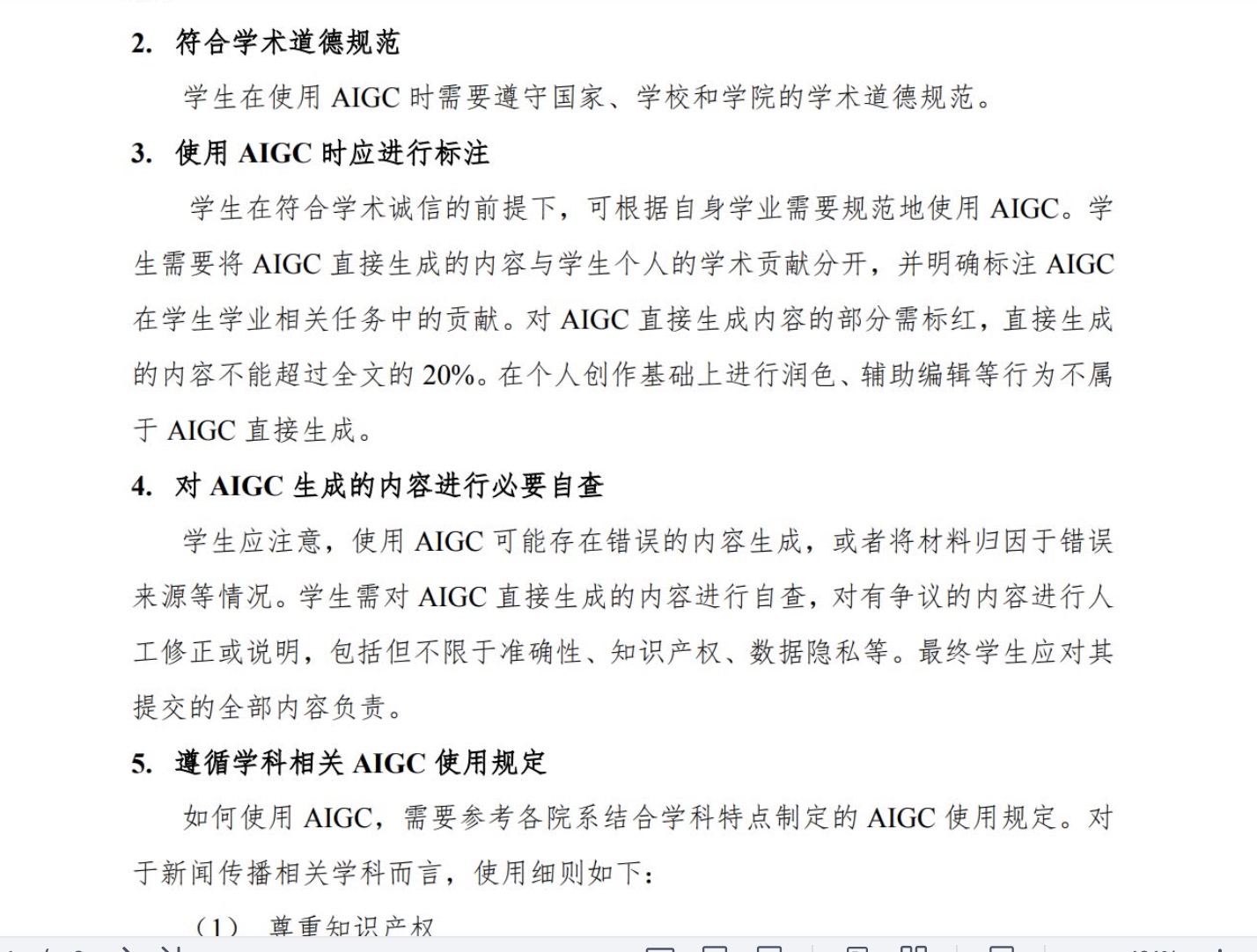 复旦大学在其出台的《规定》中提出了允许AI使用范围与原则,此外,在责任与署名方面,《规定》还指出,作者须对使用AI工具生成的内容负最终责任,AI工具不能被列为作者或共同作者。使用AI工具时,应确保最终作品的原创性和学术诚信,避免学术不端行为。
