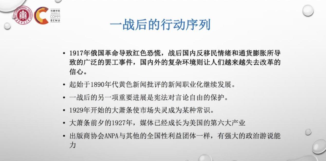 讲座伊始,陈红梅教授对“未竟的想象”作出解释,她表示,“国家干预新闻业”这一概念在二十世纪四十年代于美国提出,却一直无法成为美国境内的公共决策。随后,陈红梅教授以“传媒的社会责任理论”为中心,详细分析了从1890年代到1940年代的美国新闻业发展过程,从话语和行动两个层面探讨了知识分子的观点和实际的社会行动在这一过程中如何交错并置发展。通过对发展过程进行分析,陈红梅教授提出,当1940年代“国家干预新闻业”的观念变得清晰时,实践层面的制度改革的可能性却逐渐消失。