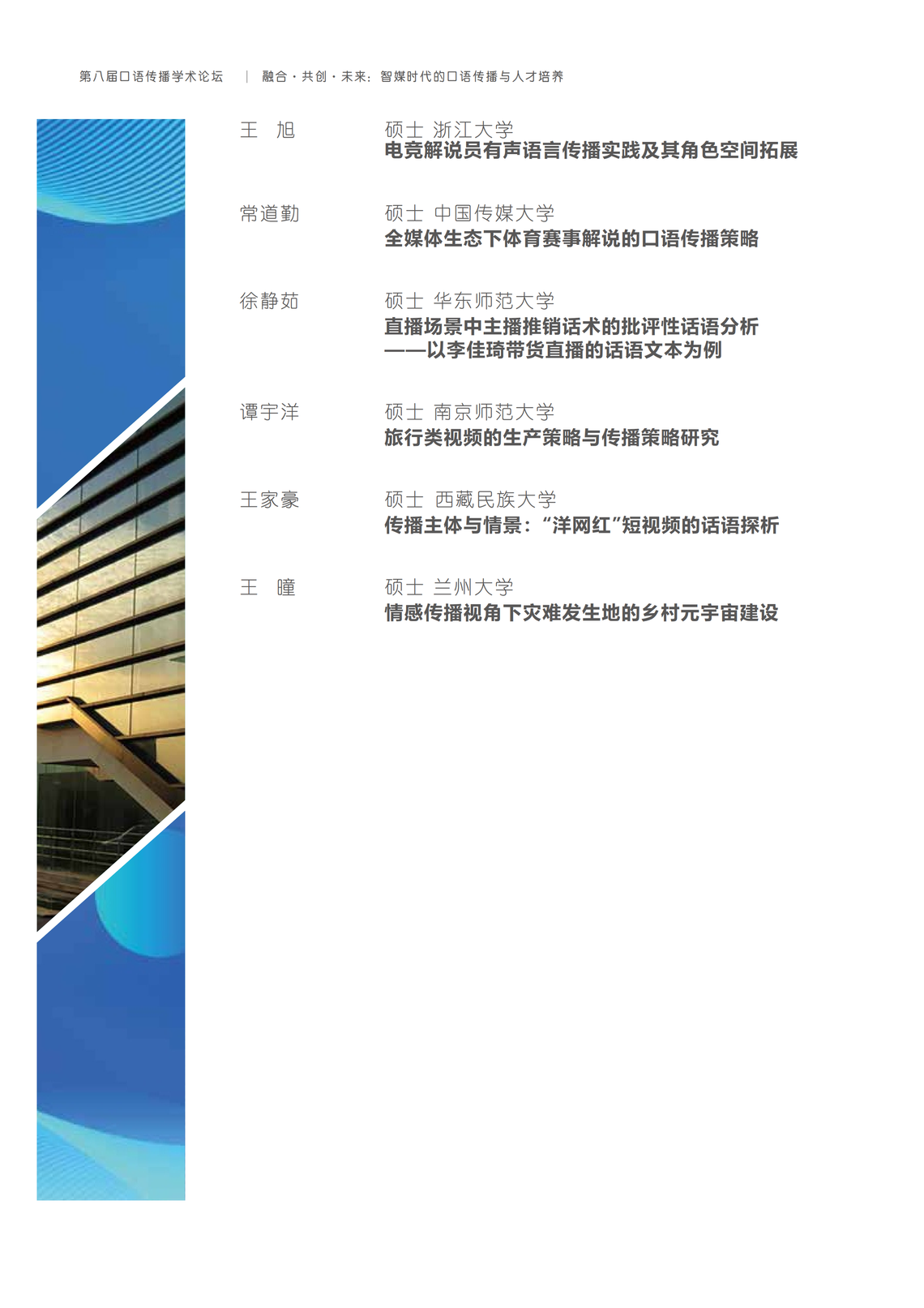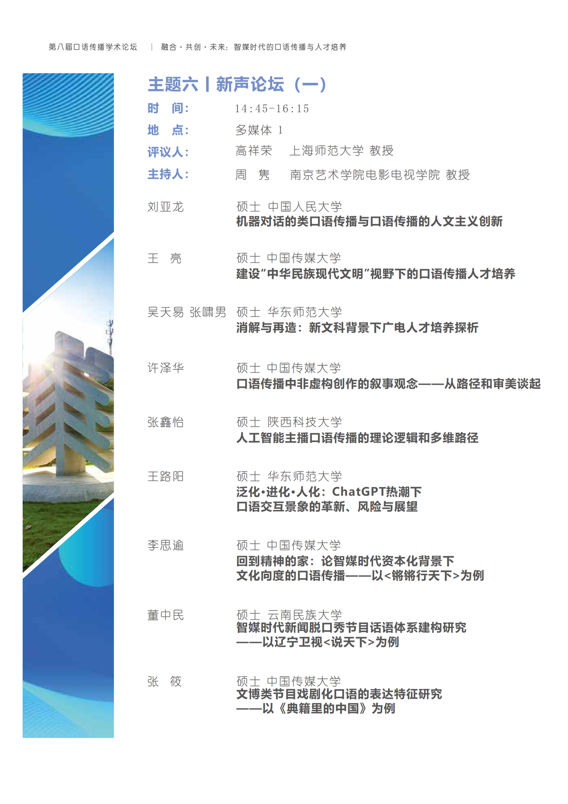 习近平总书记在党的二十大报告中指出,加快构建中国话语和中国叙事体系,讲好中国故事、传播好中国声音,展现可信、可爱、可敬的中国形象。在新时代全面构建具有中国特色的话语体系背景下,口语传播作为主要叙事方式,始终扮演着不可或缺的角色,其理论与实践为讲好中国式现代化故事、推进中国式现代化建设提供重要力量。面对智能时代技术变革与媒体深度融合的国家战略,口语传播更应提高自身站位,实现全方位、矩阵式、立体化的学科建设和传播实践。在贯彻落实二十大精神的基础上,积极思考,创新求变;坚持以效果为导向,以技术为支撑,生动鲜活地讲好中国故事,真正做到与历史接洽,与未来相拥。
