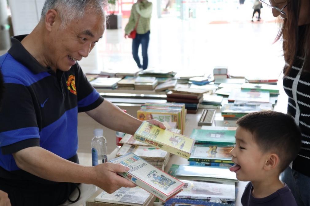 朱凤涛在“以书换书”的活动现场和路过的一位小朋友聊天