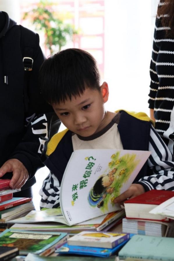 “以书换书”的活动现场,一位小朋友在翻看桌上的绘本