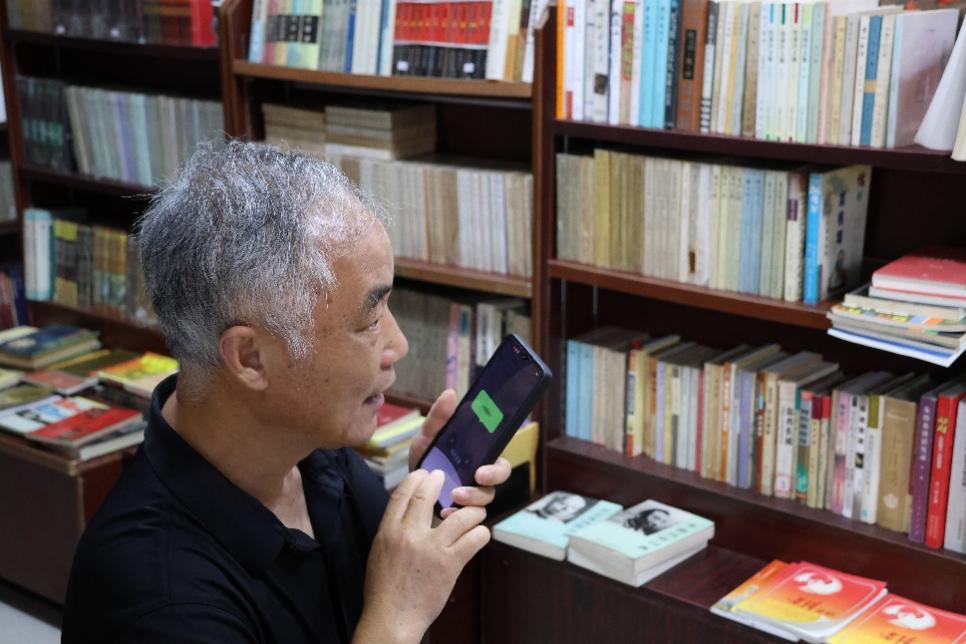 朱凤涛在打电话沟通小朱书店即将举办的一场交流活动的事宜