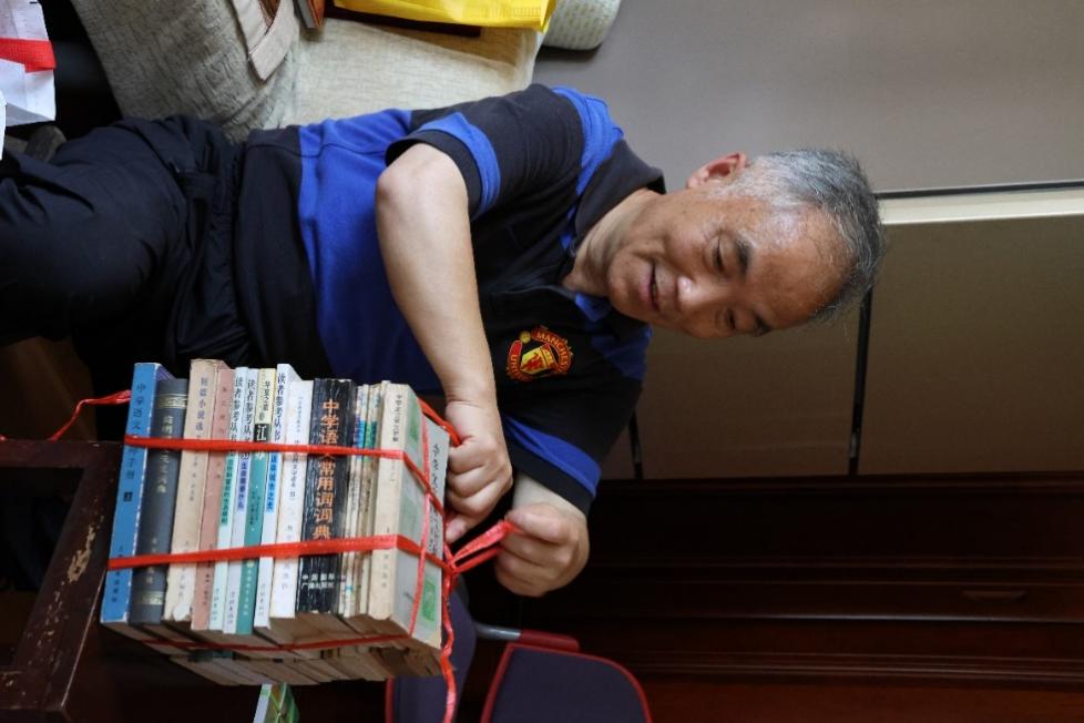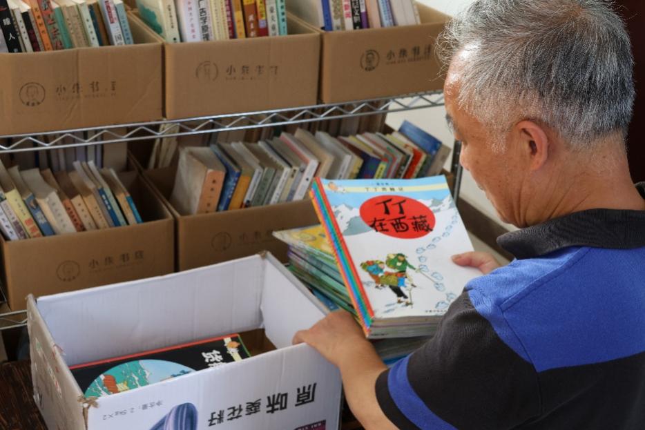 朱凤涛在认真地挑拣出书者计划处理掉的闲置书籍